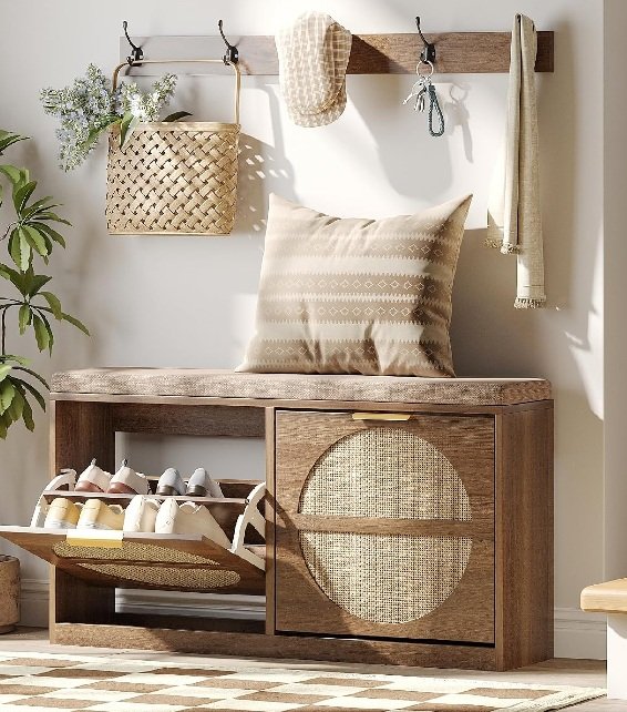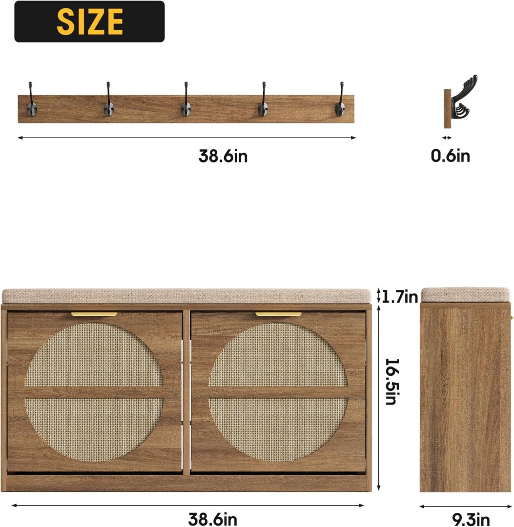 WINWY arched rattan entryway bench with coat rack and cushion with 2 flip narrow show racks - 38.6" x 9.3" x 16.5" - rustic oak rattan (model: pdkg204nu)