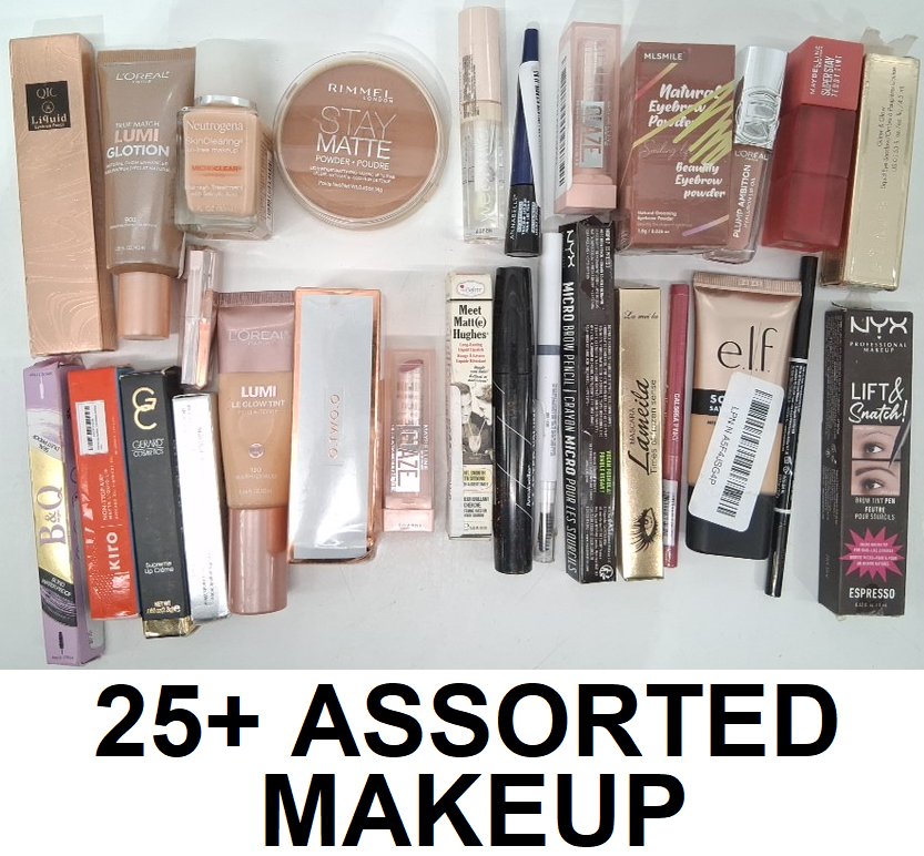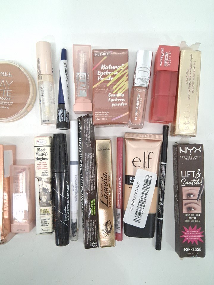 25+ ASSORTED MAKEUP PRODUCTS - assorted brands, shades and finishes - foundation / mascara / eyeliner / lipstick / lip gloss / brow pencil / powder