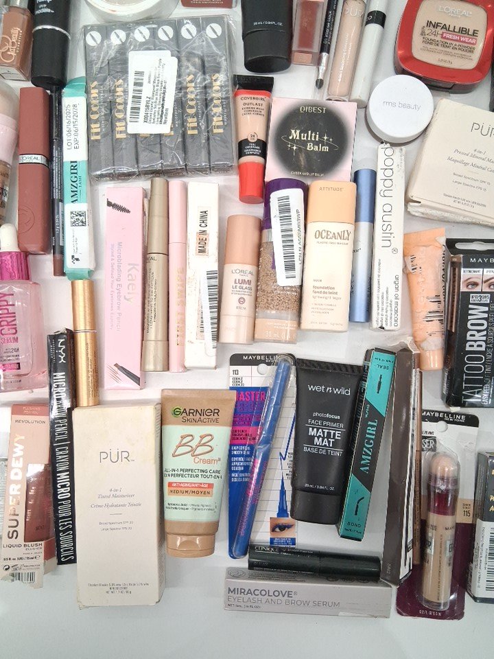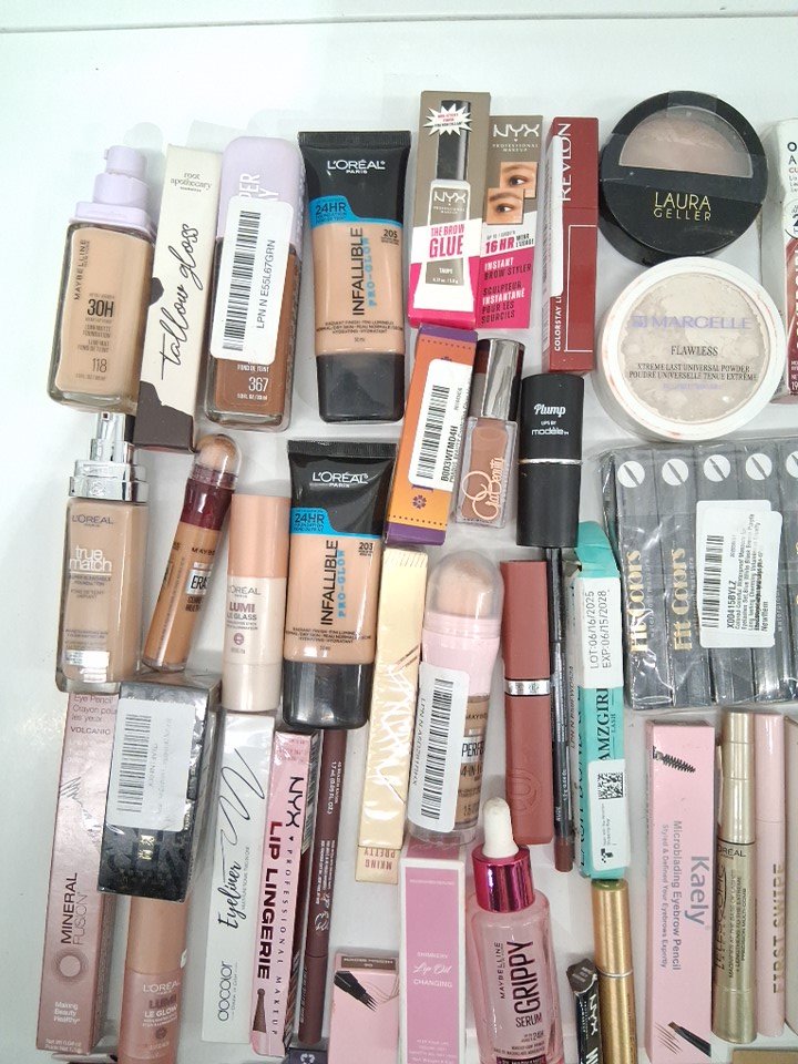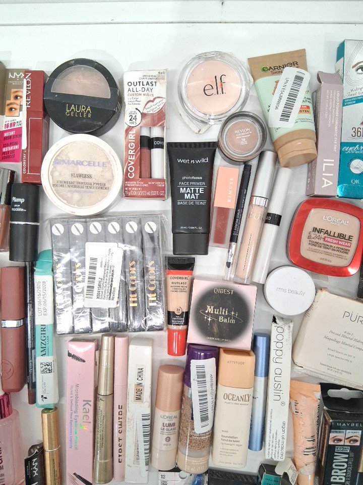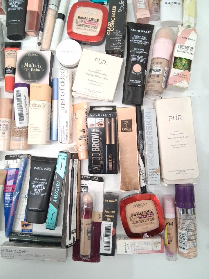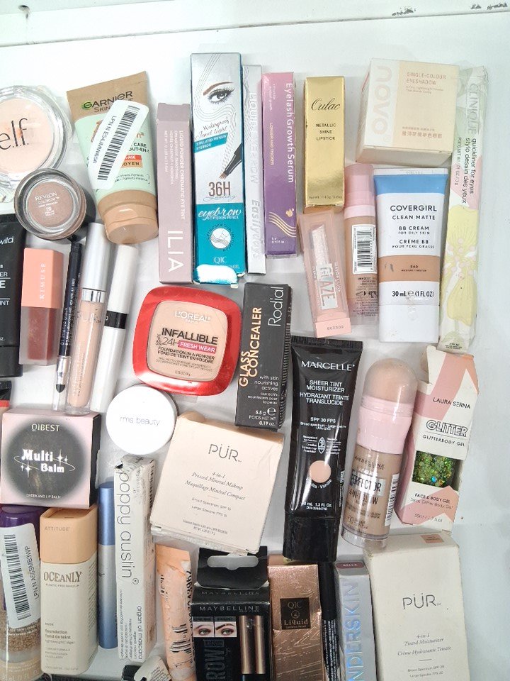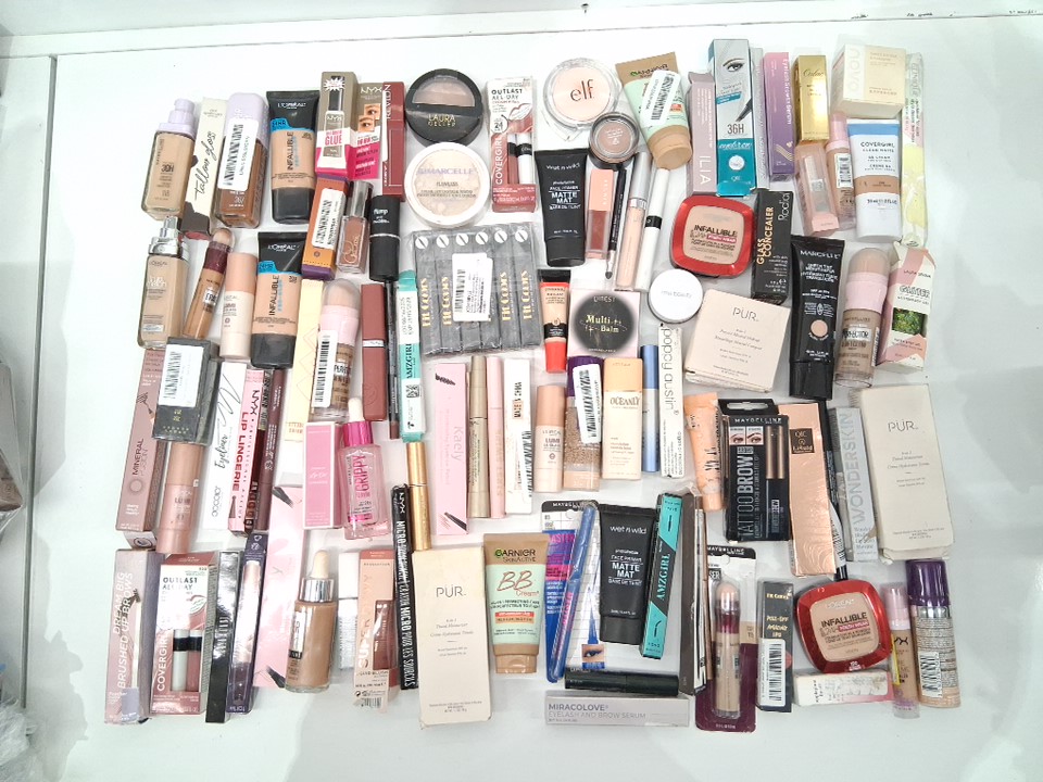 100+ assorted makeup products - assorted brands, shades and finishes - foundation / concealer / lipstick / brow gel / mascara / primer / EYELINER / BODY GLITTER / LIP GLOSS