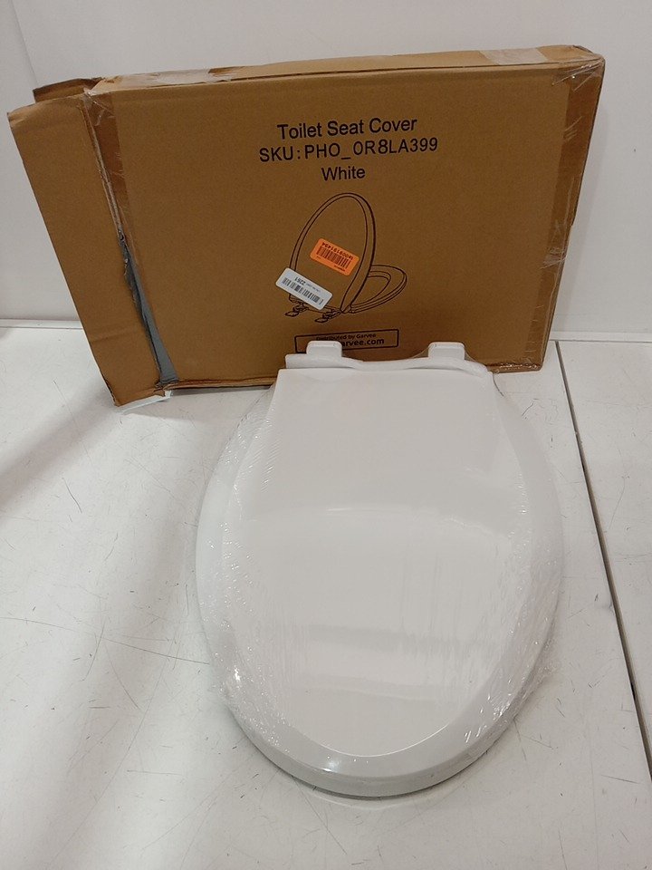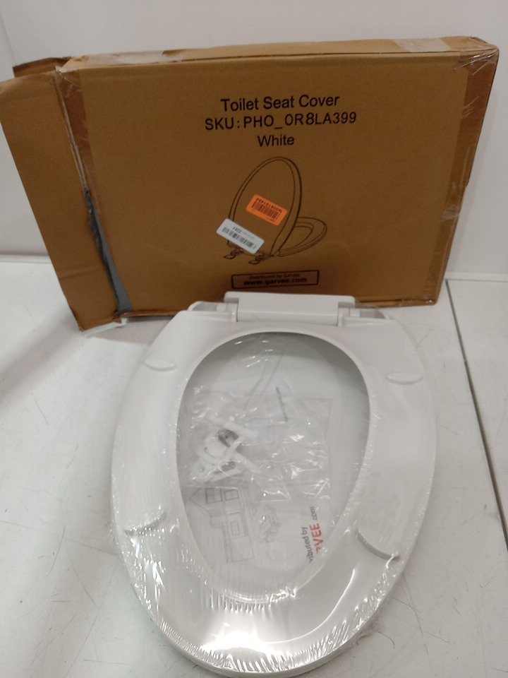 Toilet seat is still sealed in plastic.