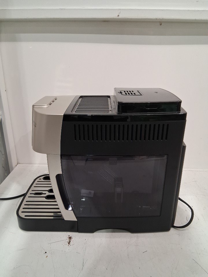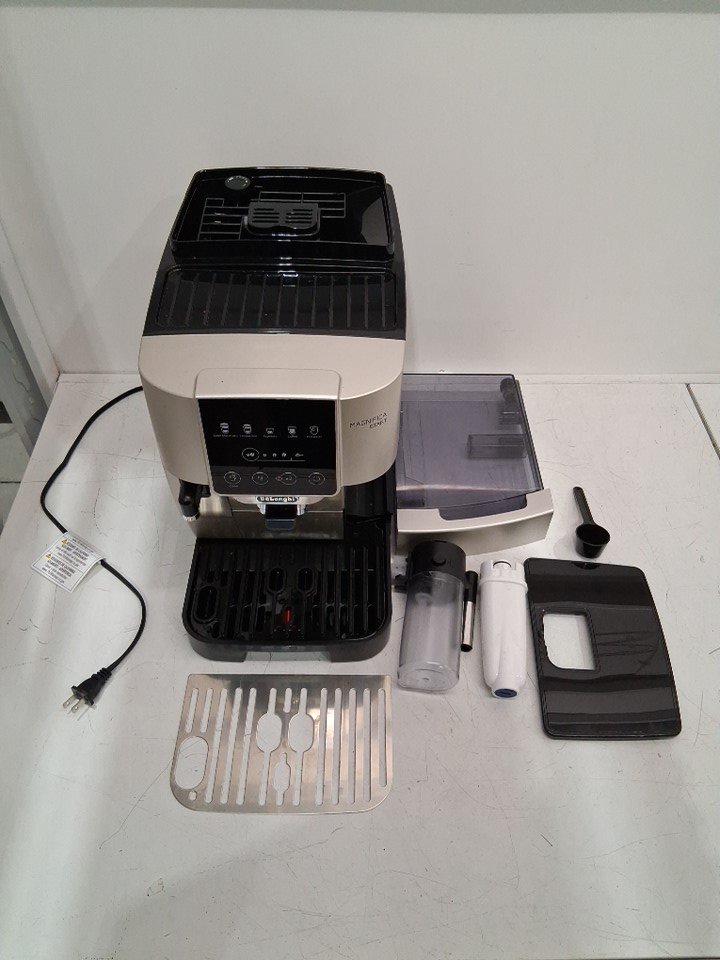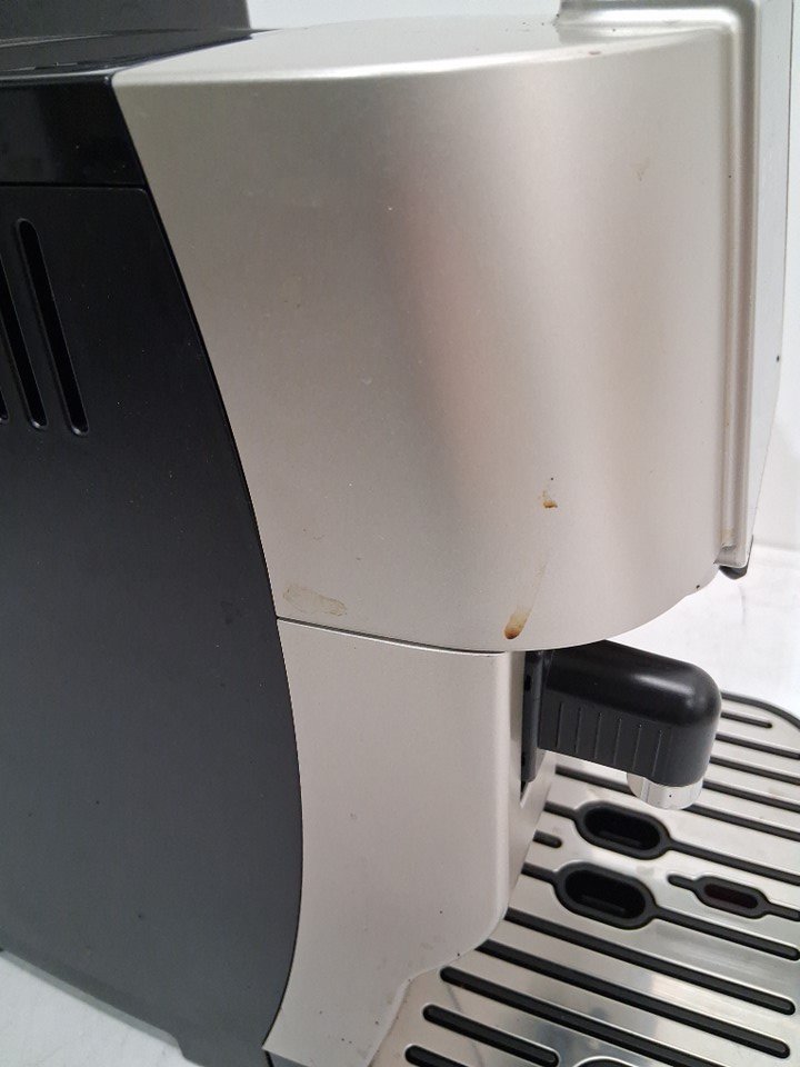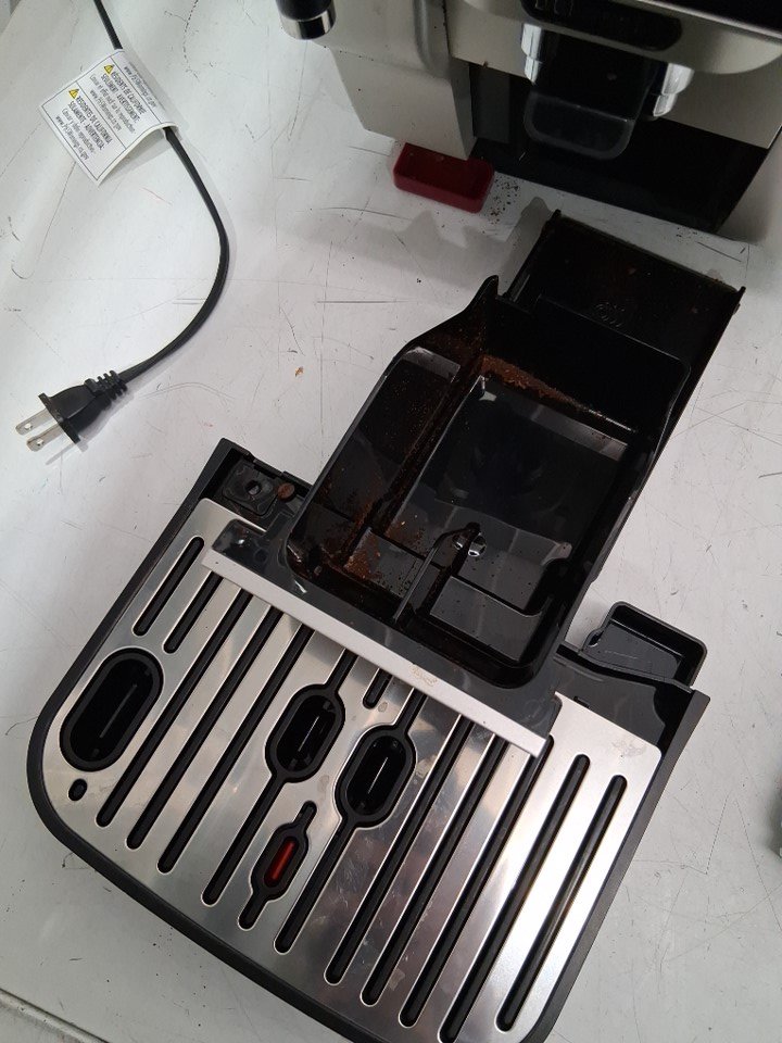 There are coffee grinds, coffee stains and some water droplet residue on the coffee machine/attachments due to previous use. (Please see photos) The coffee machine was tested for basic power.
