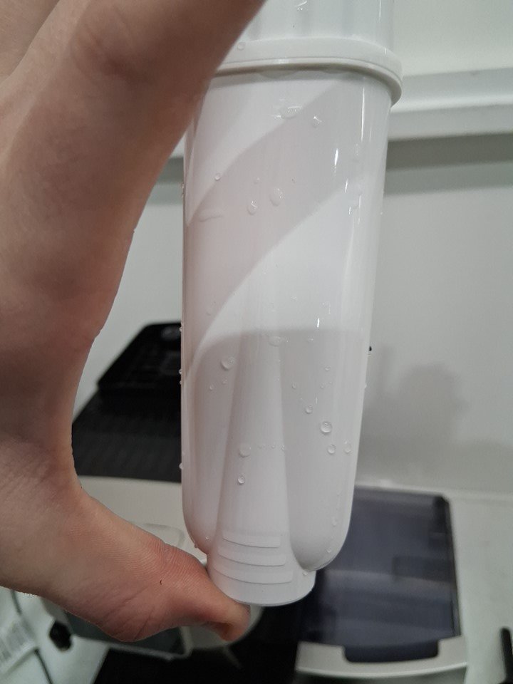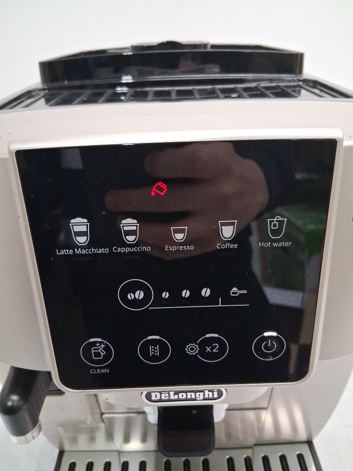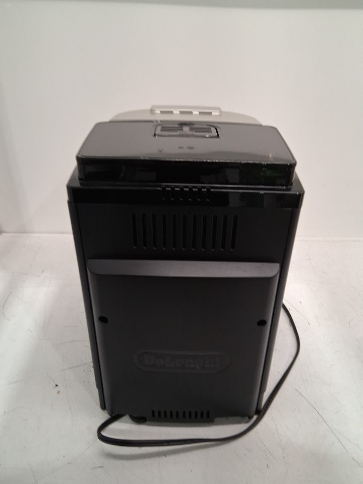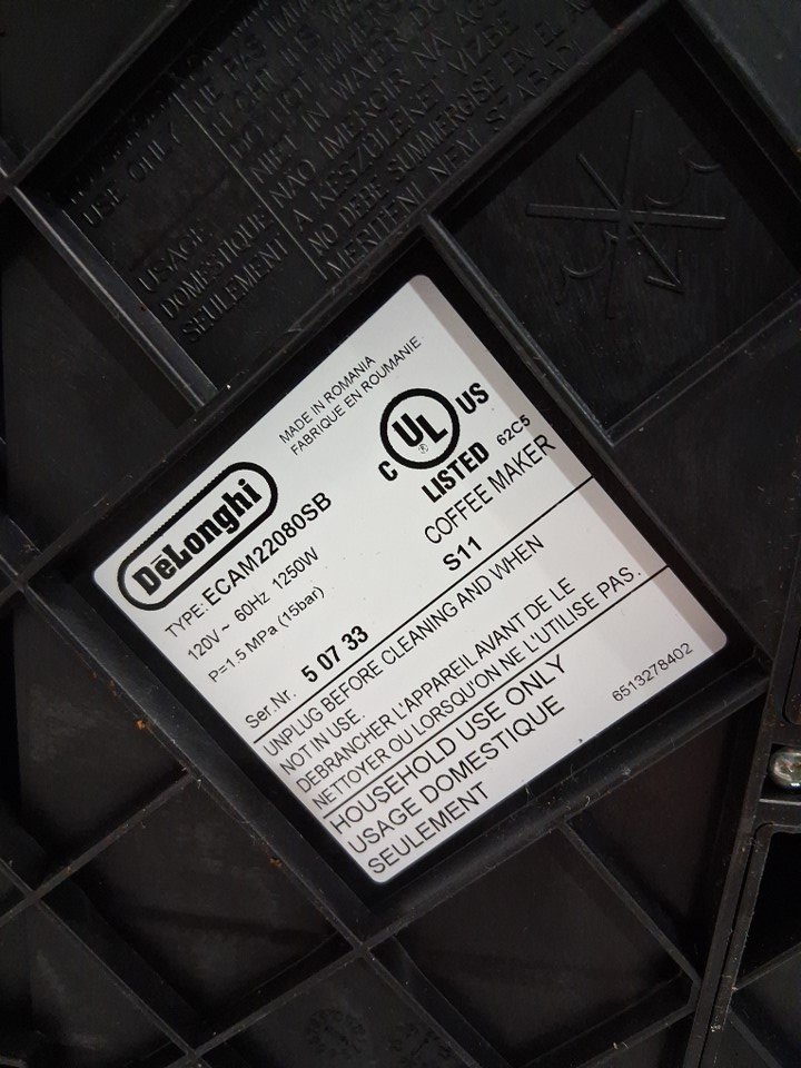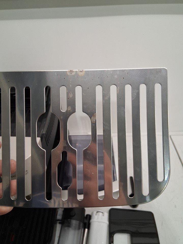 There are coffee grinds, coffee stains and some water droplet residue on the coffee machine/attachments due to previous use. (Please see photos) The coffee machine was tested for basic power.