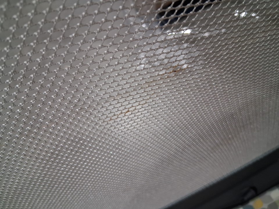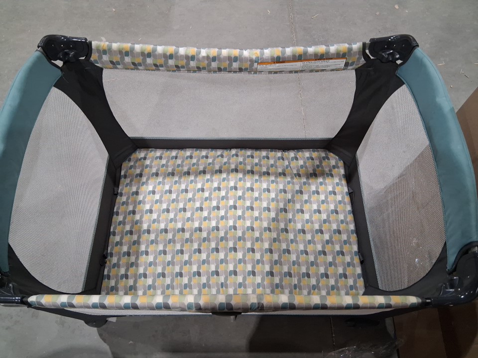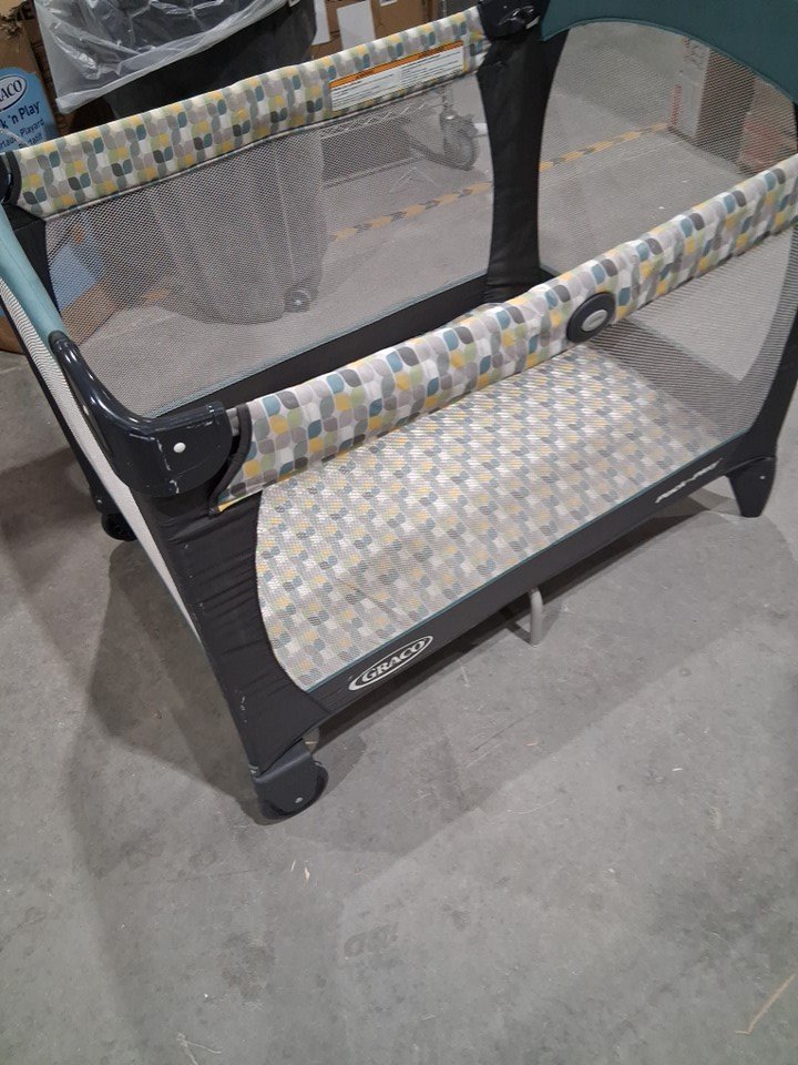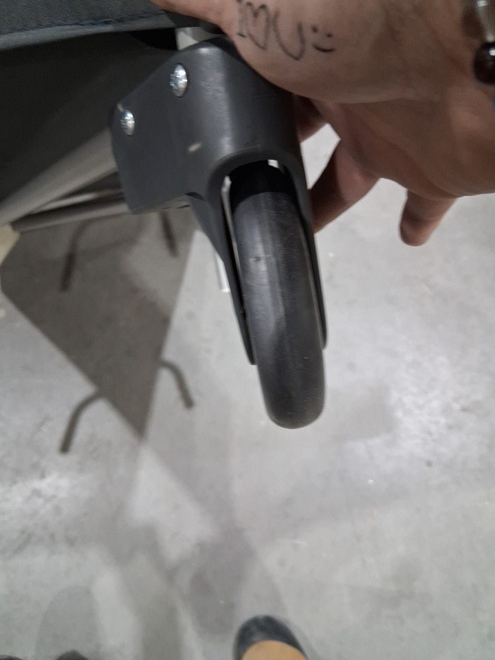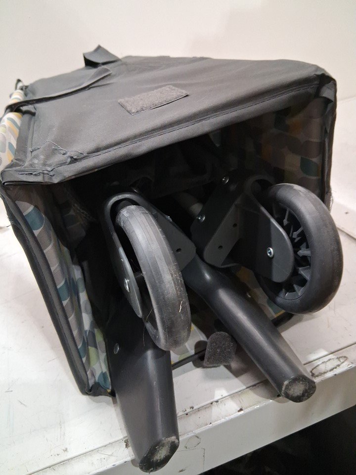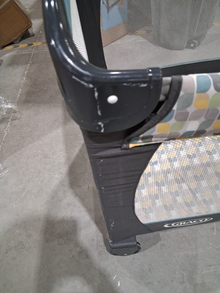 there is some light stains on edge of rails and some dust on wheels. there is also some light paint scuffs on one of the corners item is missing side pouch and carrying bag