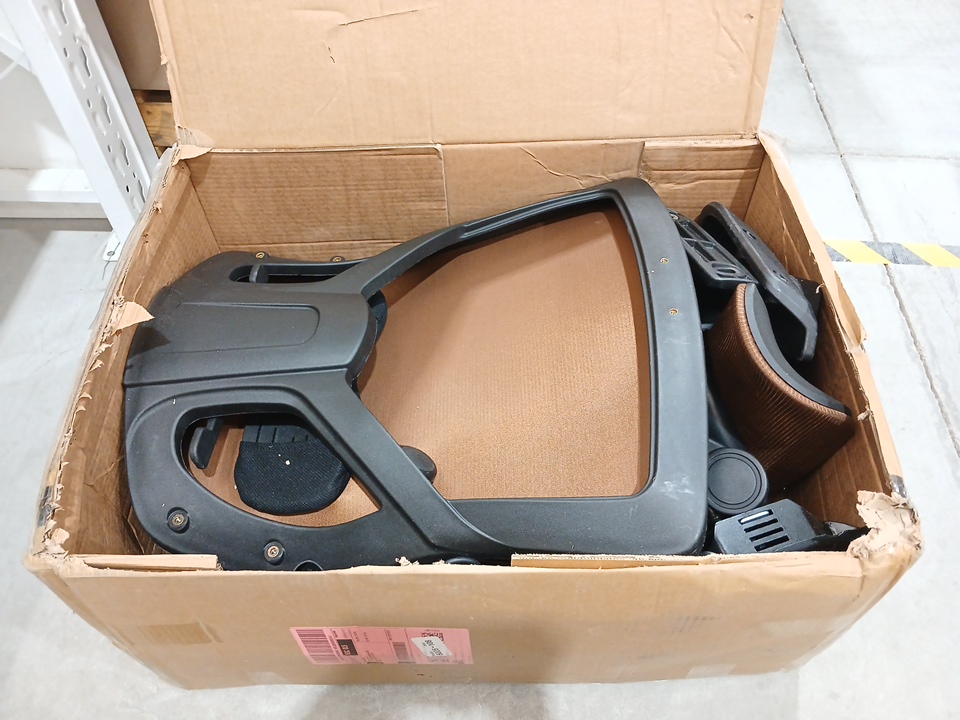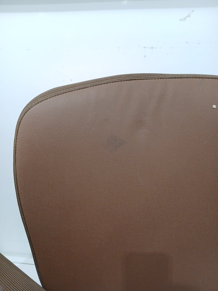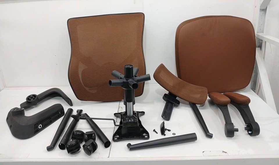 Our item is brown. The seat has a black mark on it. This item has previous assembly marks. Additional hardware may be required for assembly