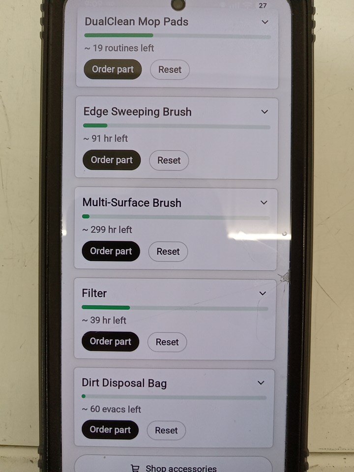 Item tested for power and wifi/app connectivity. We were unable to test the item any further as we found that the robot vacuum will not hold a charge (the internal battery will need to be replaced) and as a result from this that's why the item is being marked handled with issue. The item shows signs of being previously used prior to being returned, there is dust/debris on/in the robot vacuum and the base station. There also is some light scuffs on the robot vacuum. There is some light wear on the side brush, the main brush and the mop pads. Please refer to the attached photos to see everything included with the item as there may be some accessories missing.