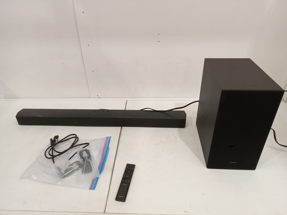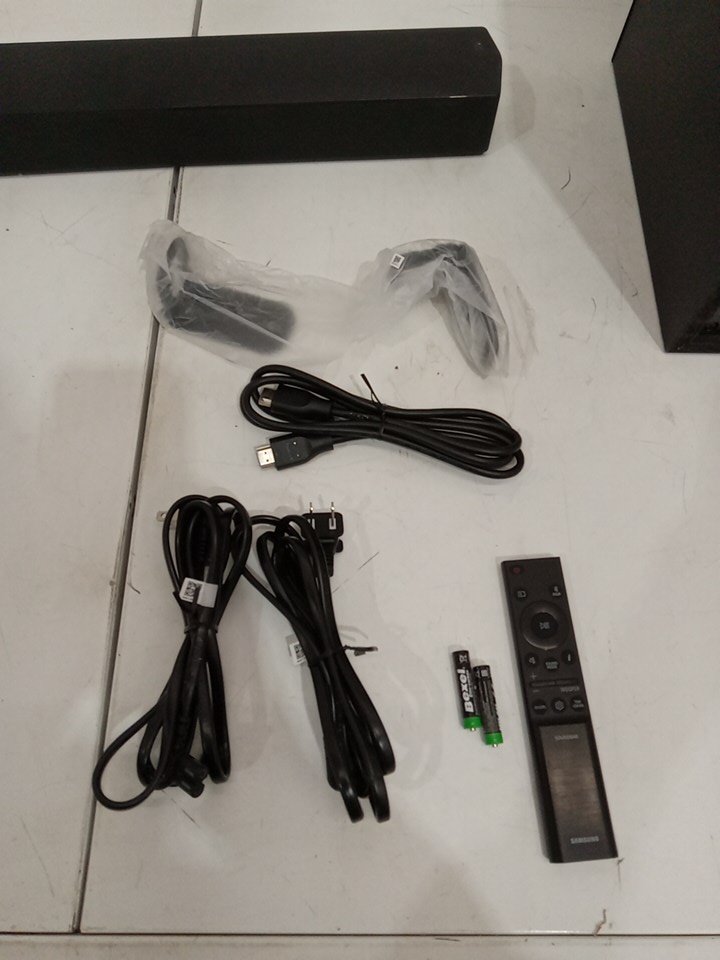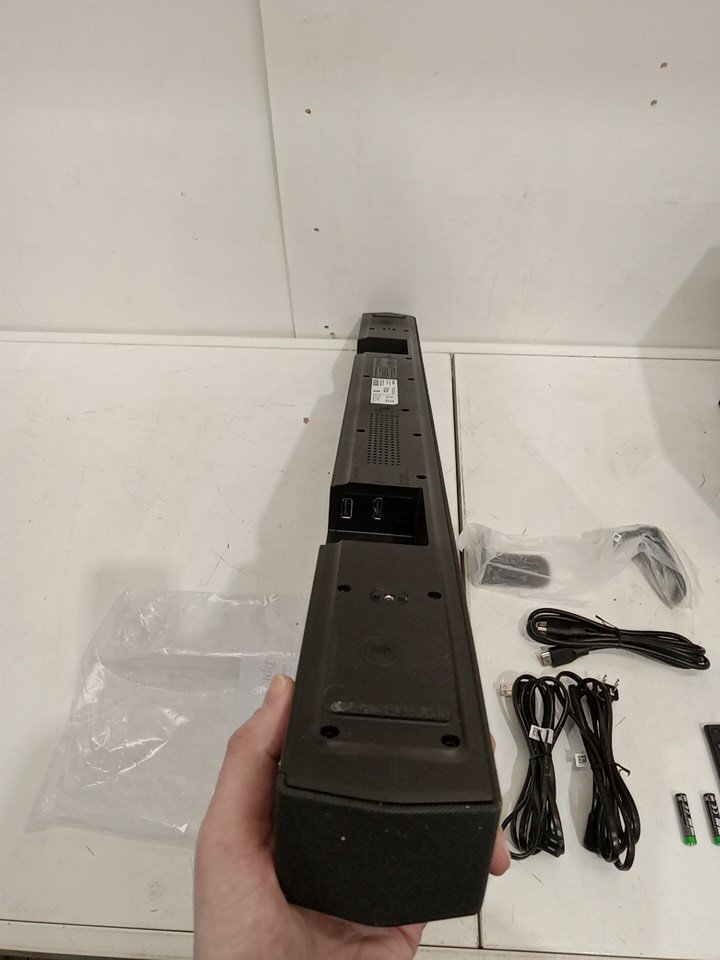 Item tested and working. There are some minor scuffs/scratches on both the soundbar and the subwoofer as a result from previous use/shipping. There is a small puncture in the fabric of the front of the subwoofer but it's only the fabric piece, there is no damage to the subwoofer so this just effects the visual appeal of the item. Hardware will be required to install the brackets. See attached photos.