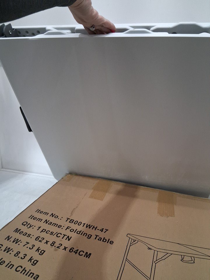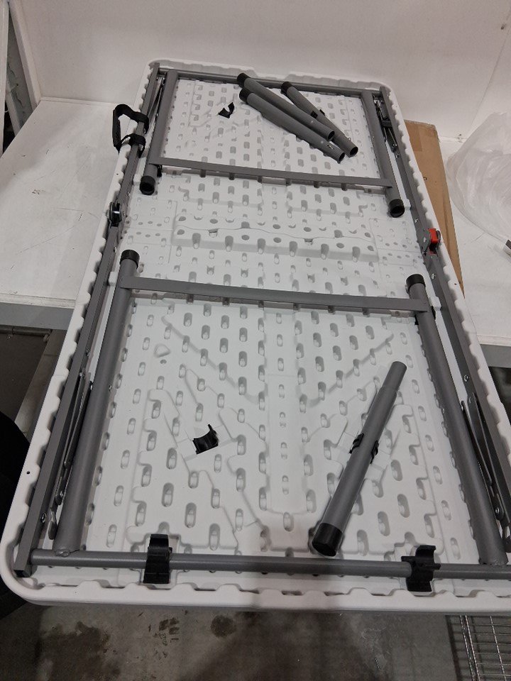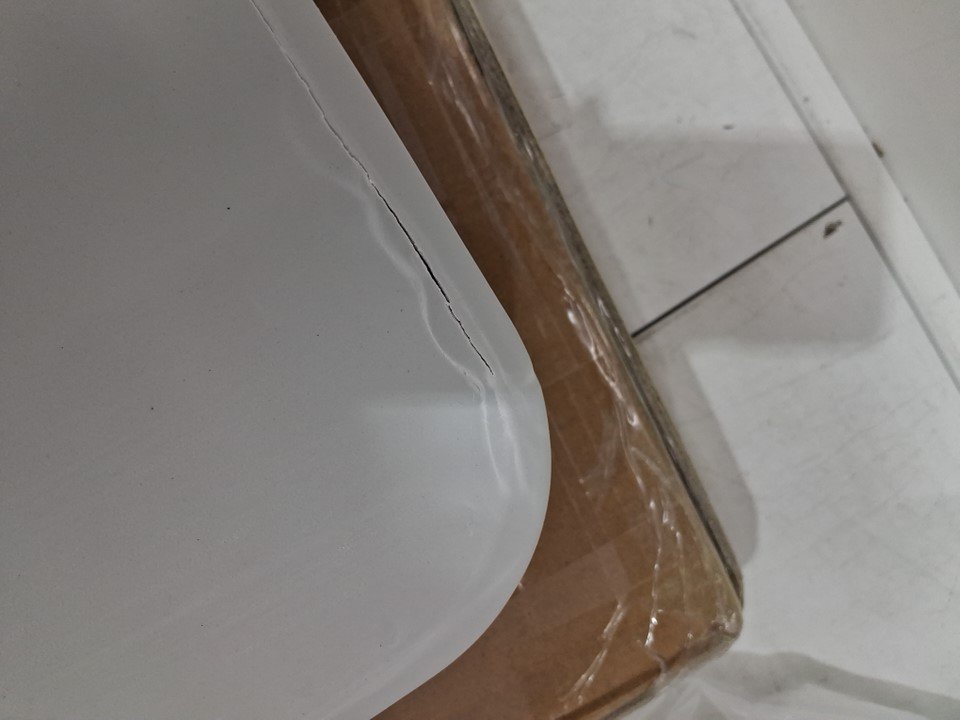 has some cracking on the corner and edges of the item. there is also some dirt and debris present on the item. bottom leg plastic cover are cracking.