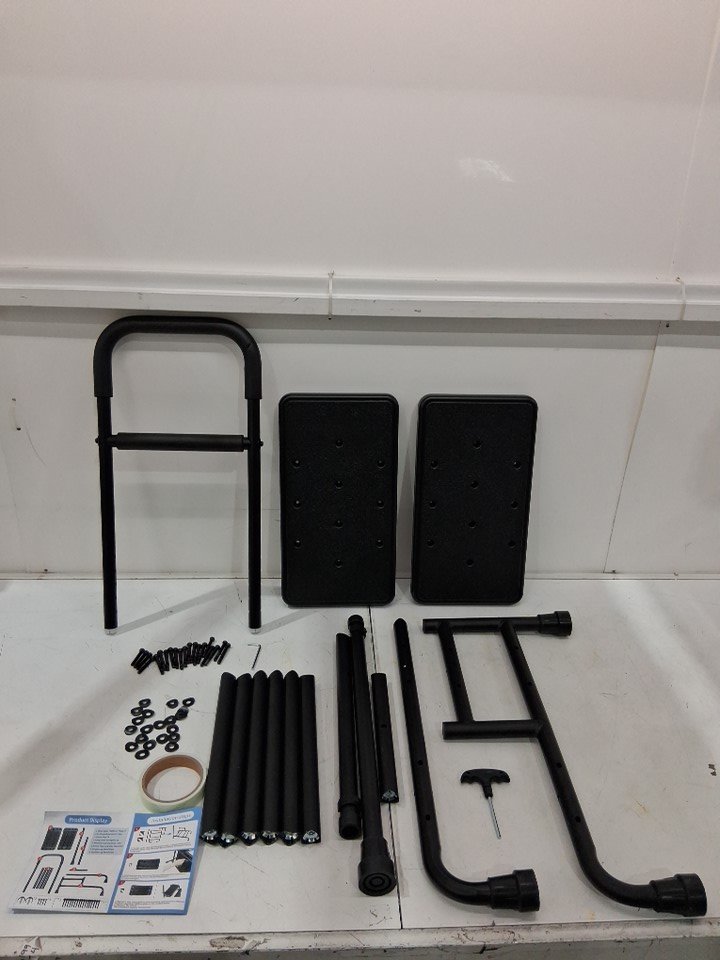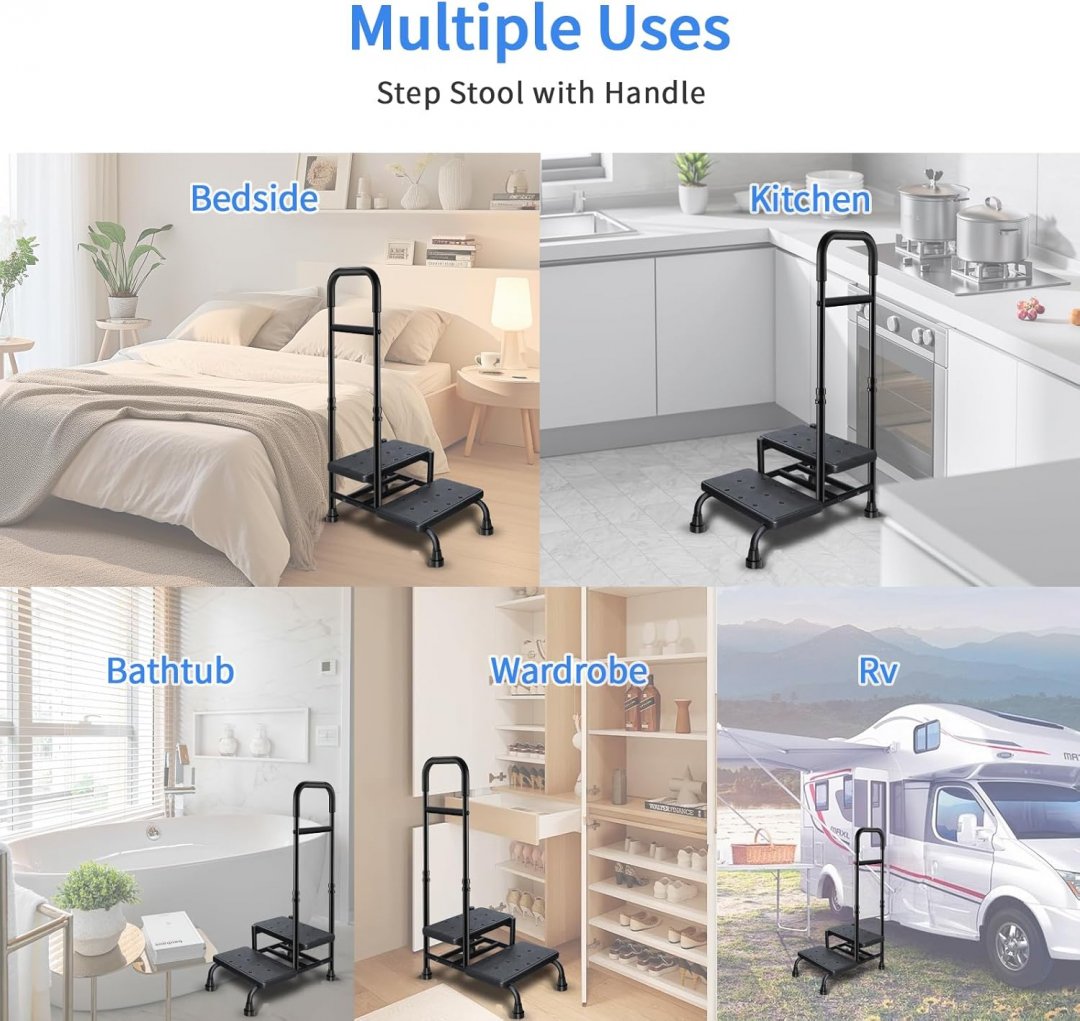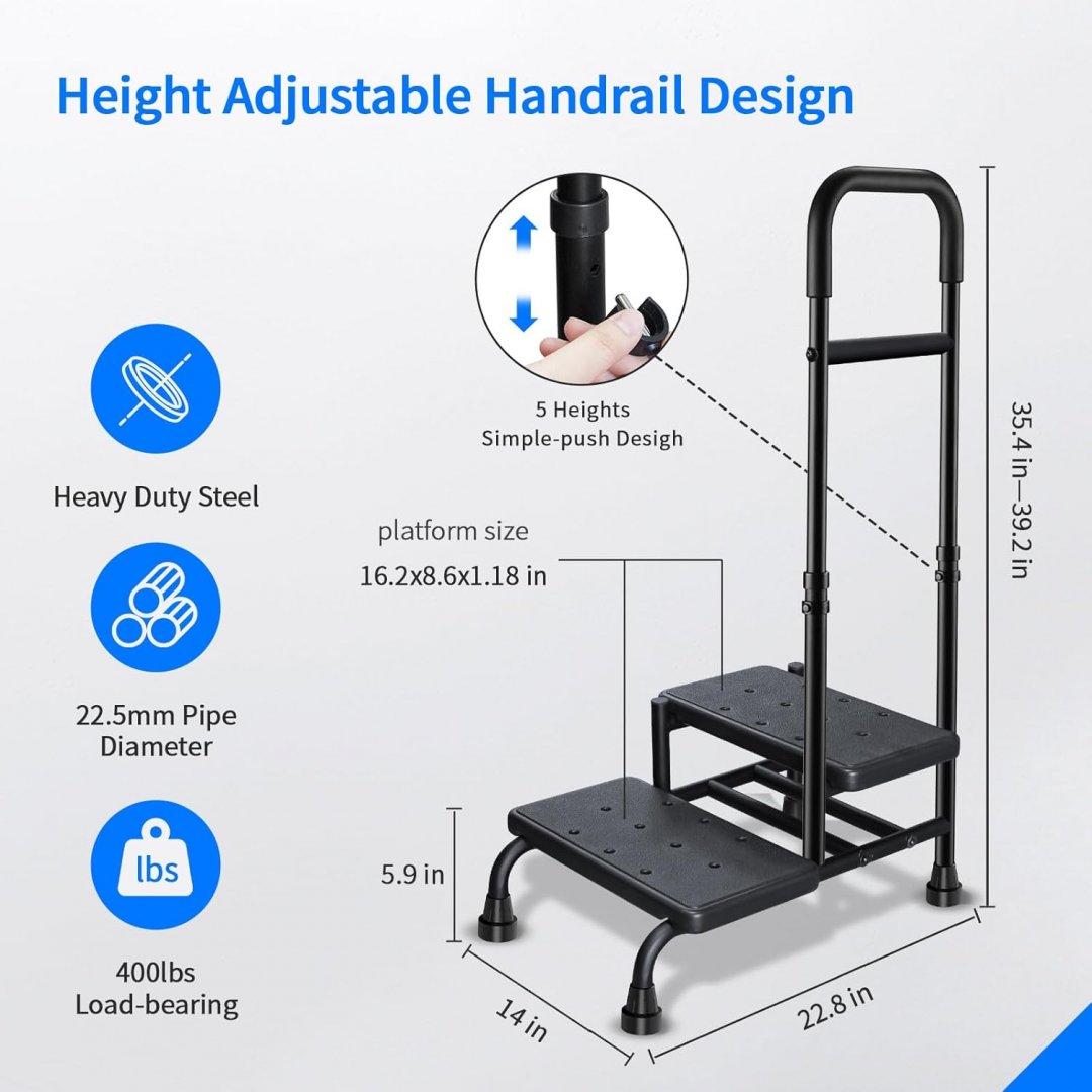 whomec Step Stool with Adjustable handrail and two steps for bed/trailer/tub - 14" x 23" x 35"-39" - black