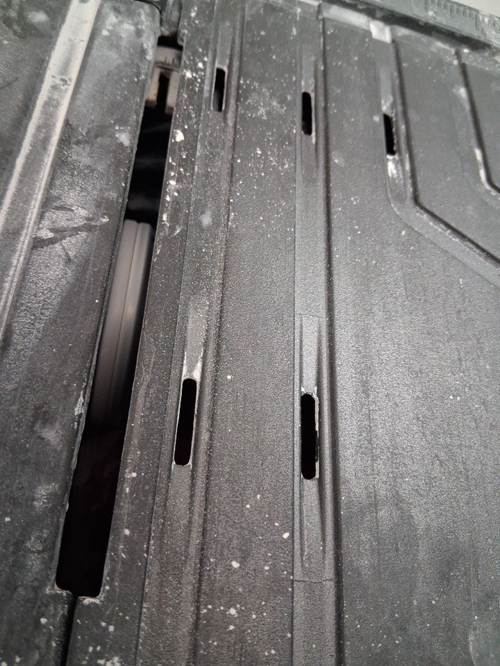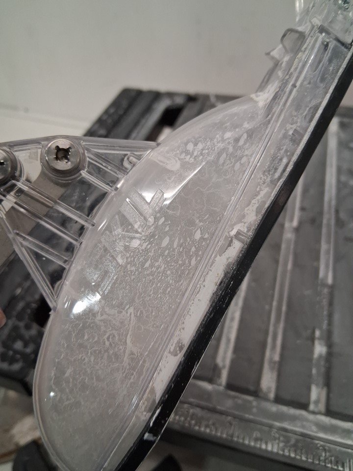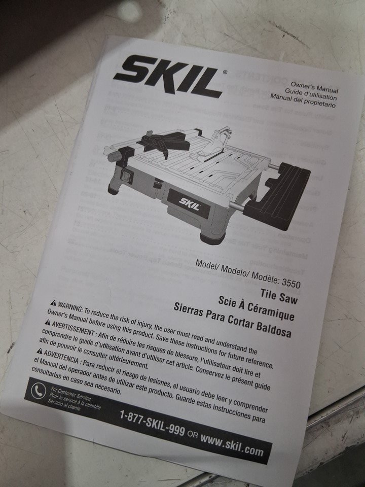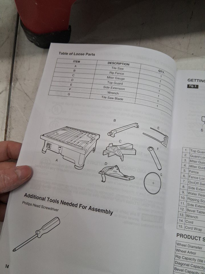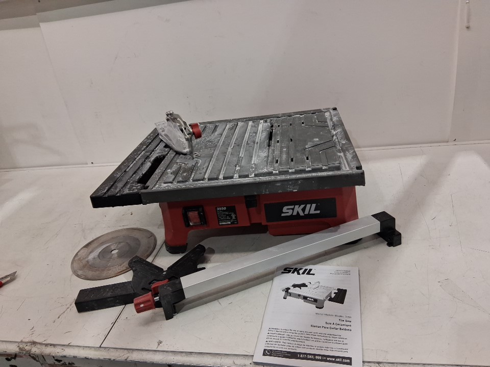 Tested for power, there are white marks on saw and attachments from use also missing side extension, see photos.