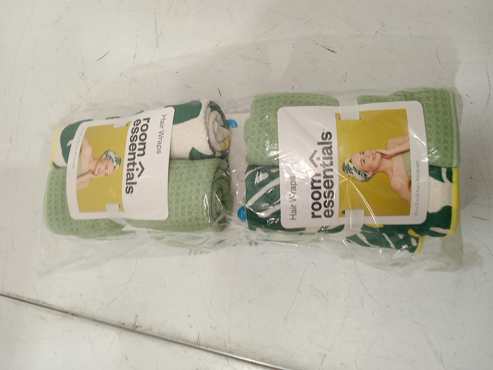 4(2PK) ROOM Essentials POLYSETER hair wrap towels - OSFM - green/leafs