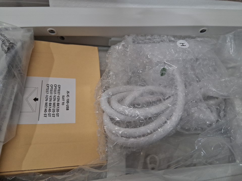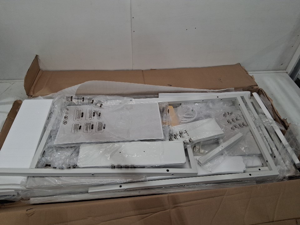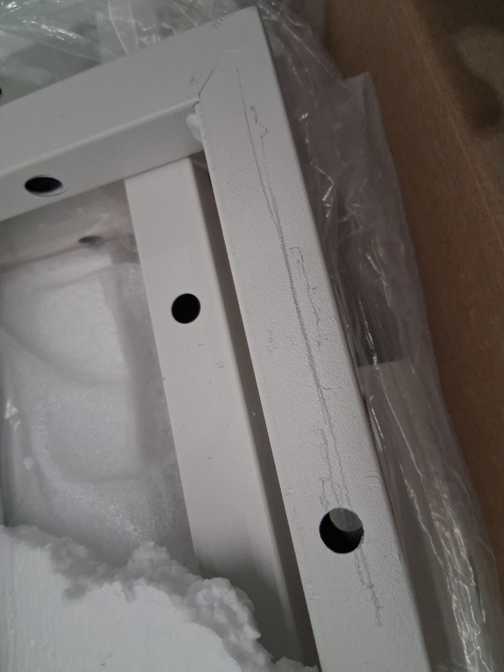 There are some scratches on one of the metal legs due to shipping. Additionally, hardware bag appears to have ripped open, scattering the hardware around the box. As such, customer may have to provide some hardware on their own (screws, etc) in order to finish assembly, in case any has gone missing. Outside of these issues, all parts appear present and in new condition, with no obvious signs of prior use or assembly.