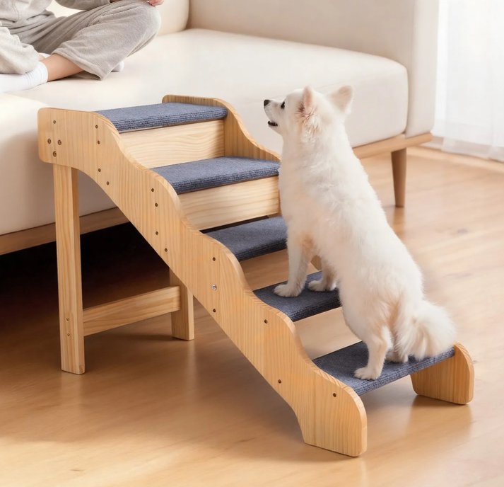 wooden 5-step non-slip pet stairs - 24.8" x 35.8" x 16.9" - natural / blue (model: zd-25dog03)