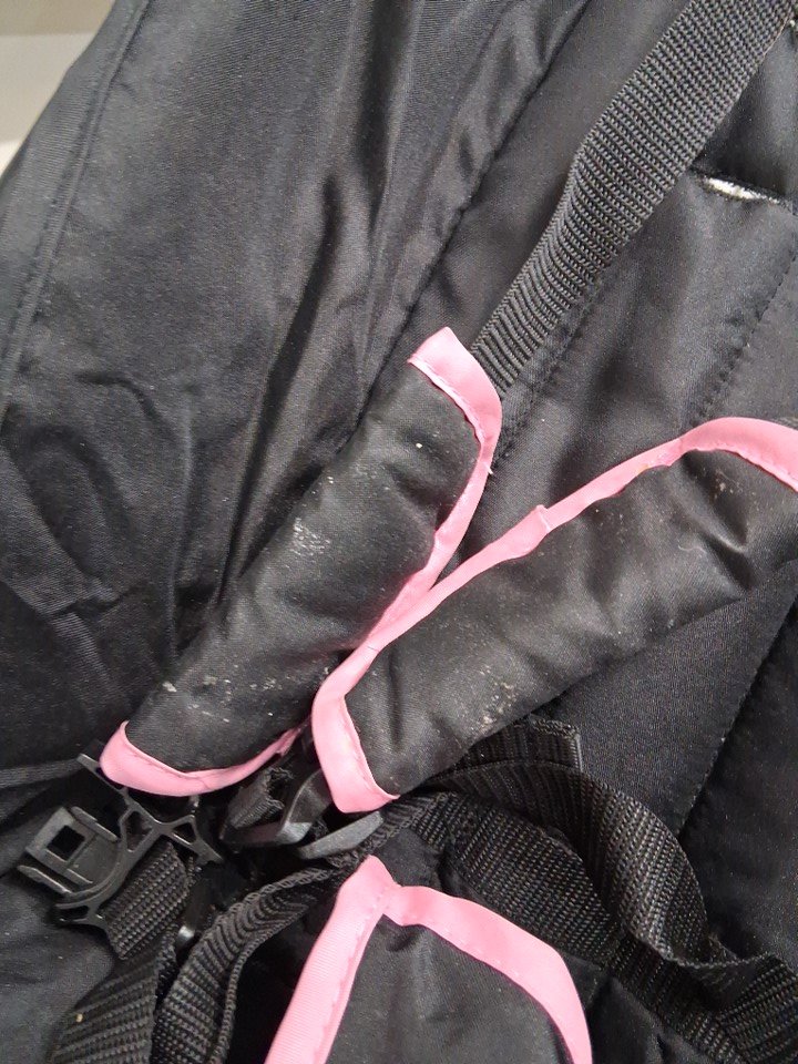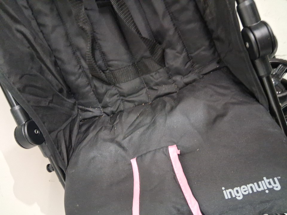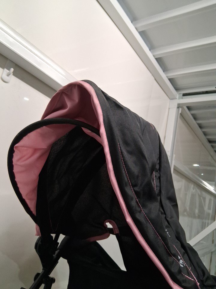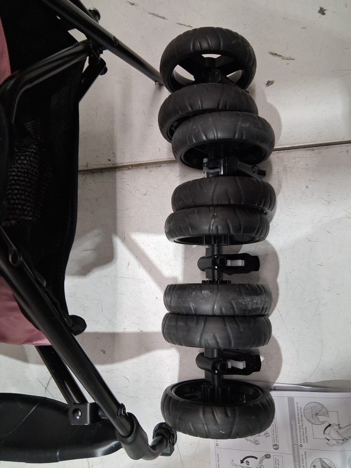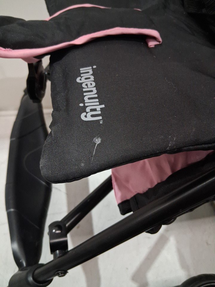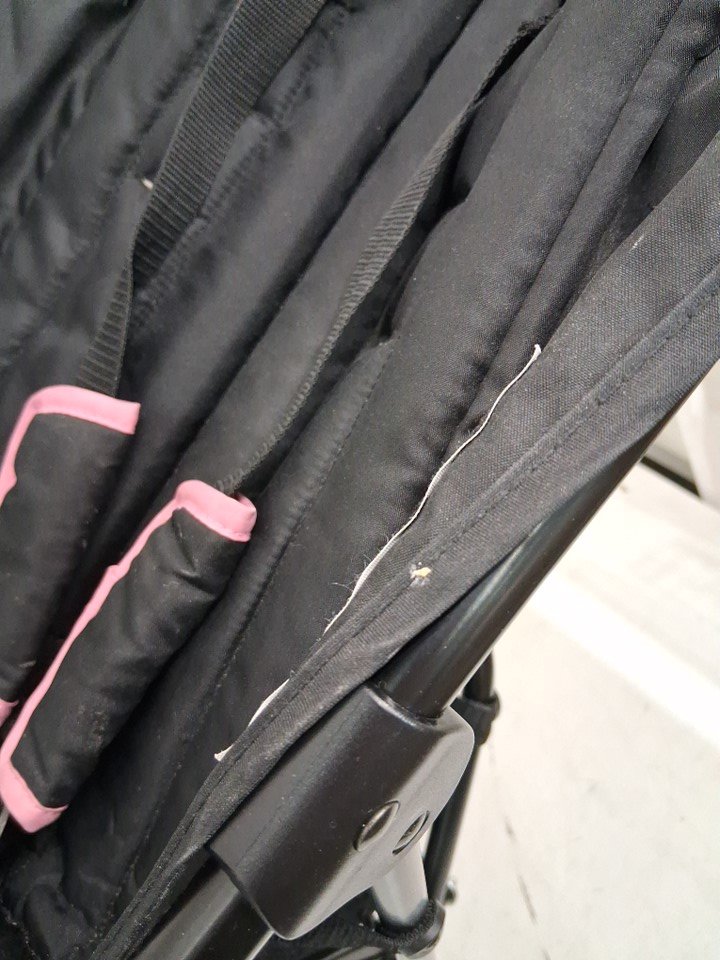 there are some light markings and dirt remaining in seat and on buckles. there is also a light amount of dust and wear on wheels from previous use please note shade is bent but still functionable