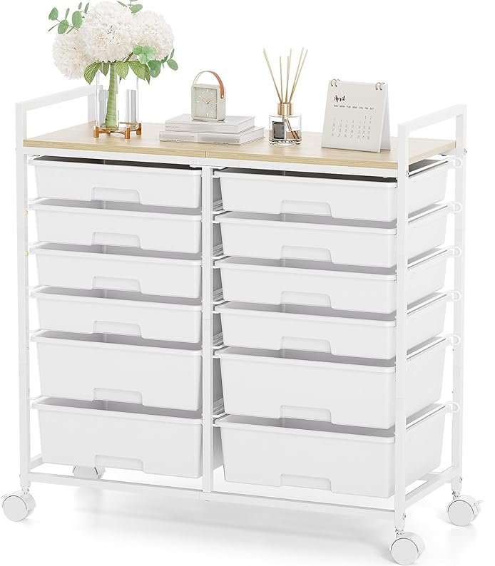 kingrack rolling storage cart with wooden top and 12 drawers - 30.24" x 30.7" x 12.44" - 11lbs capacity per drawer - white (model: wk831285)
