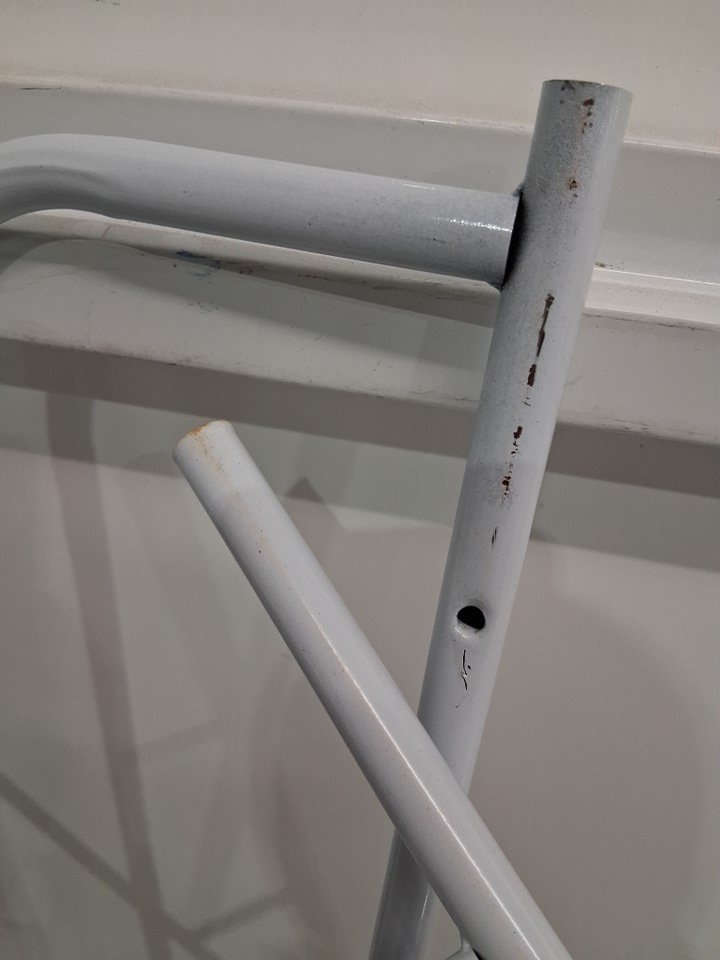 There is paint chipping on a couple of the poles, and all of the holes have screw marks on them from previously being set up/used. (Please see photos)