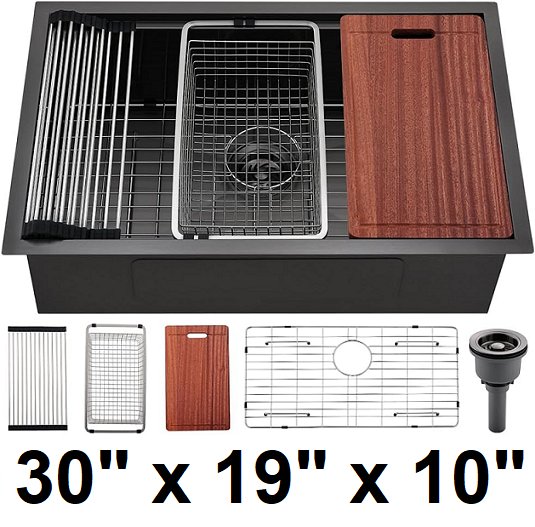 Dorzom undermount stainless steel kitchen sink with workstation, drain basket - 30" x 19" x 10" - Black (model: h003b-301910t)