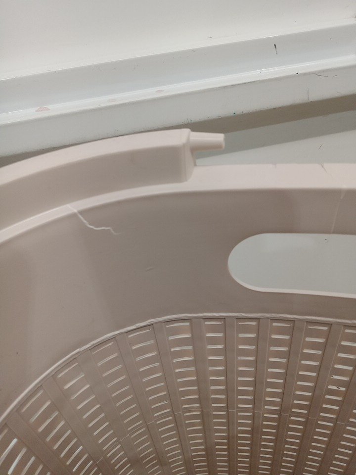 Crack in the rim and missing the lid.