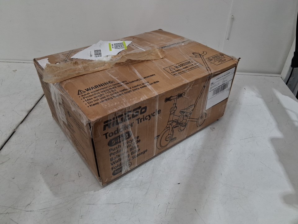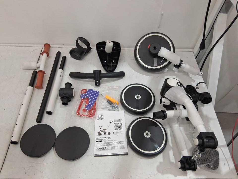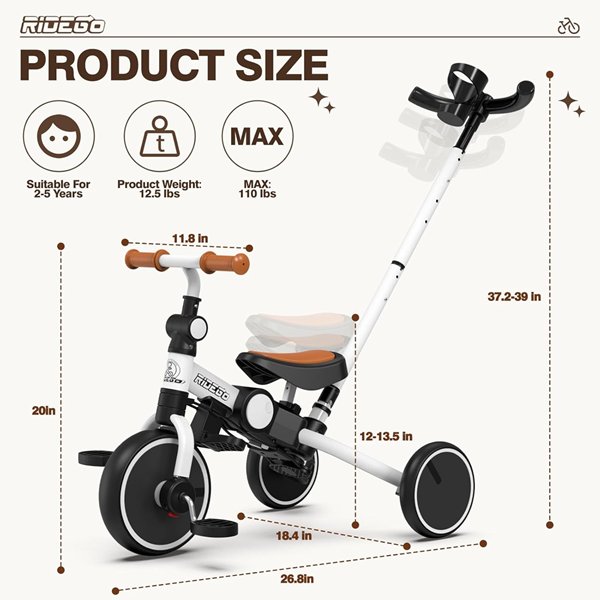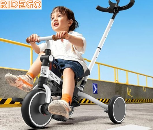 Ridego 5 in 1 Foldable Tricycle Bike with Push Handle and Cup Holder for Toddlers 3-5 Years Old - white/black