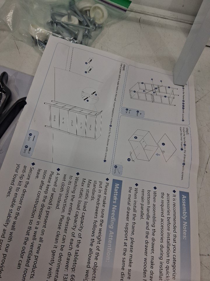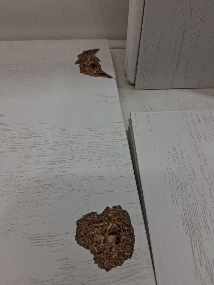 behind one of the wooden parts for dresser is damaged from use and some dents on the side posts for dresser, see photos.