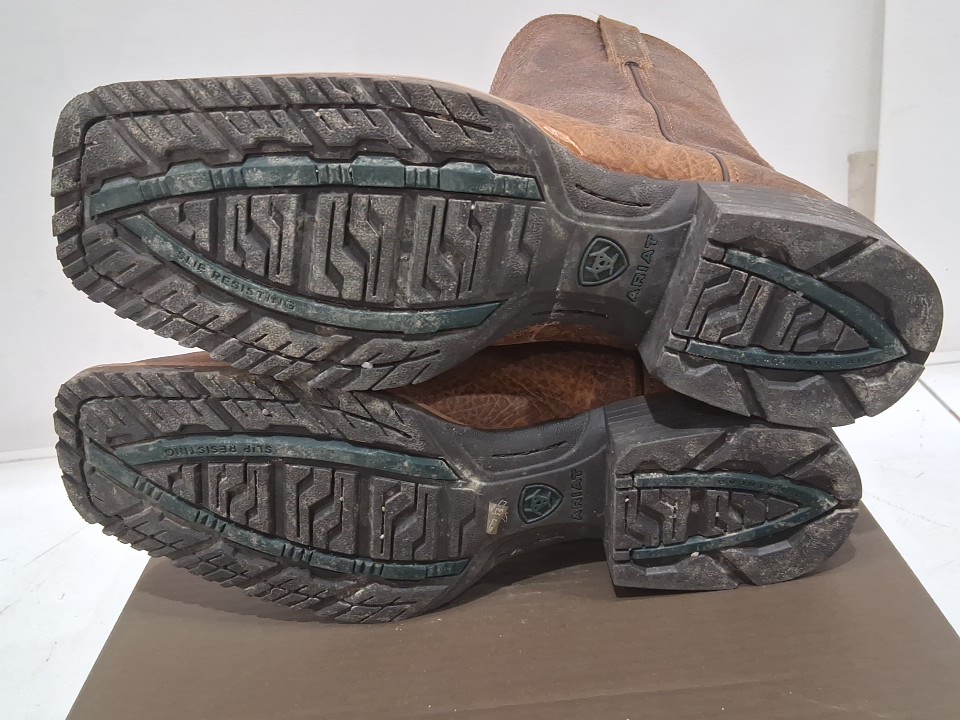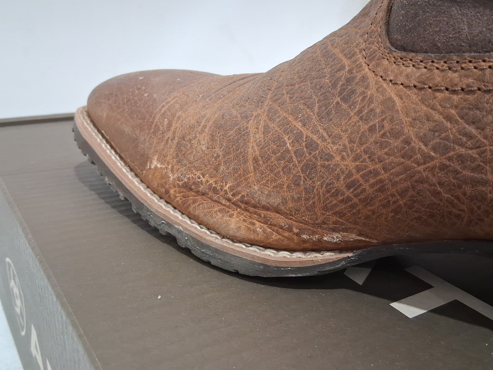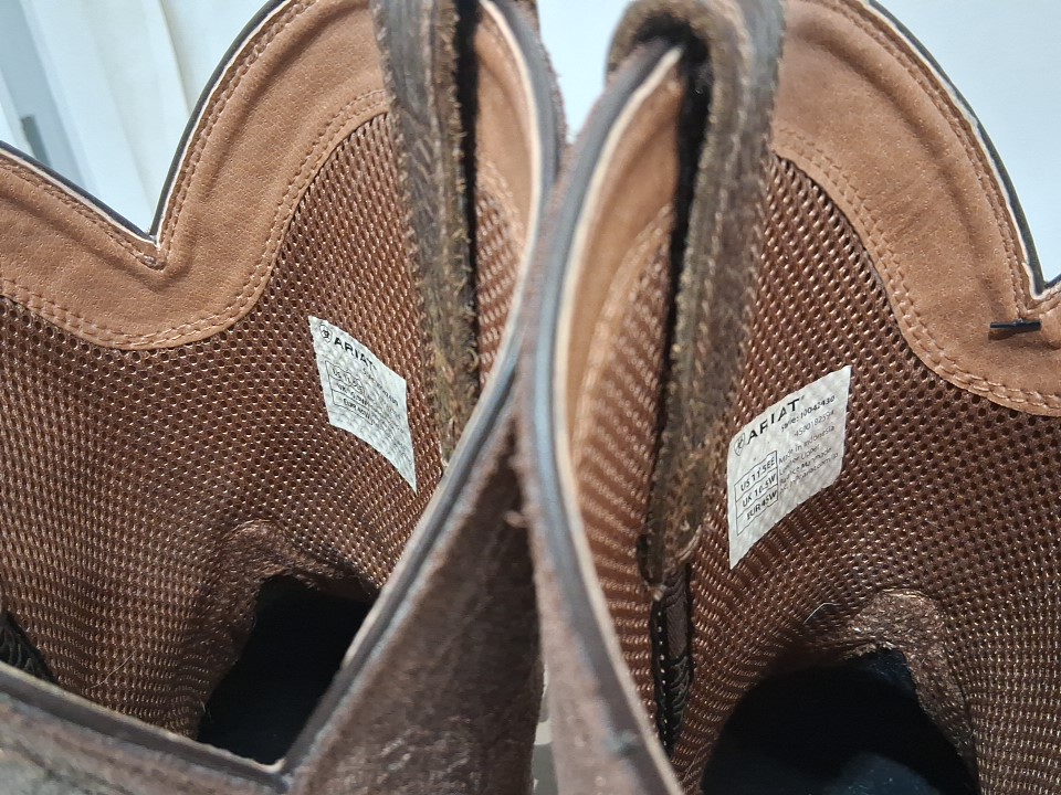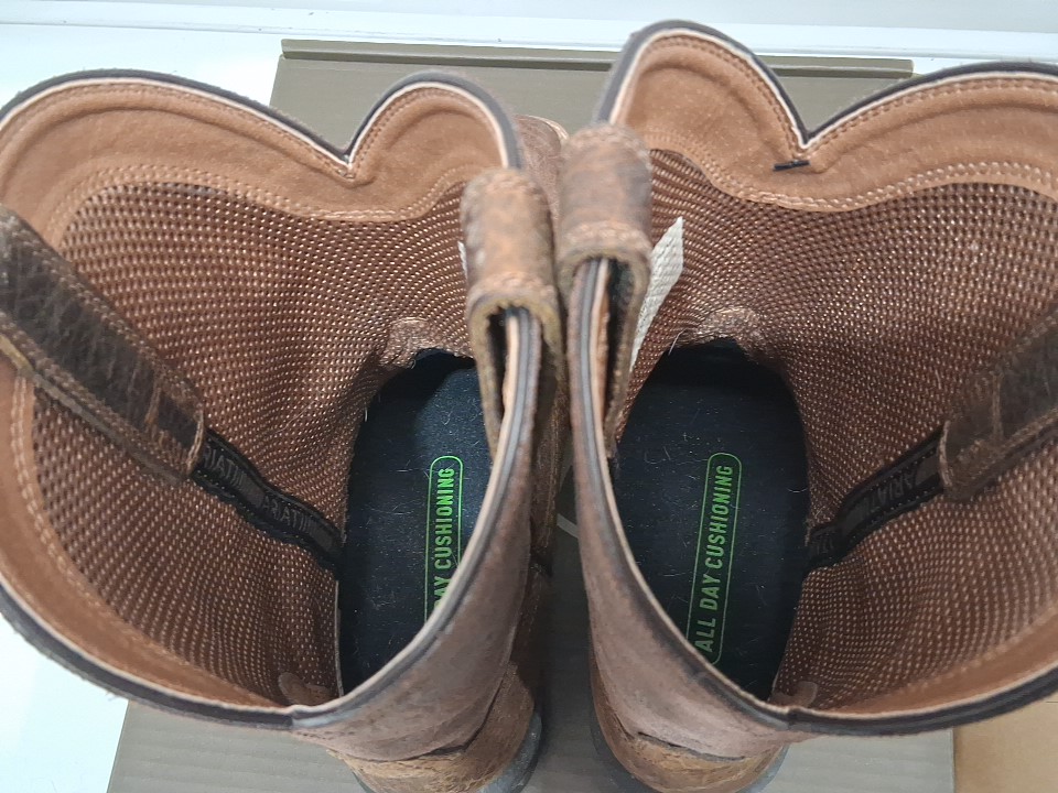 Item has small hairs/minor debris in the boots, light wear/dust markings on the exterior/soles from previous gentle use, see photos.
