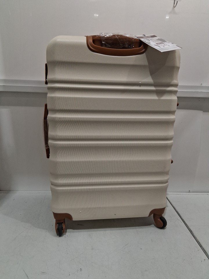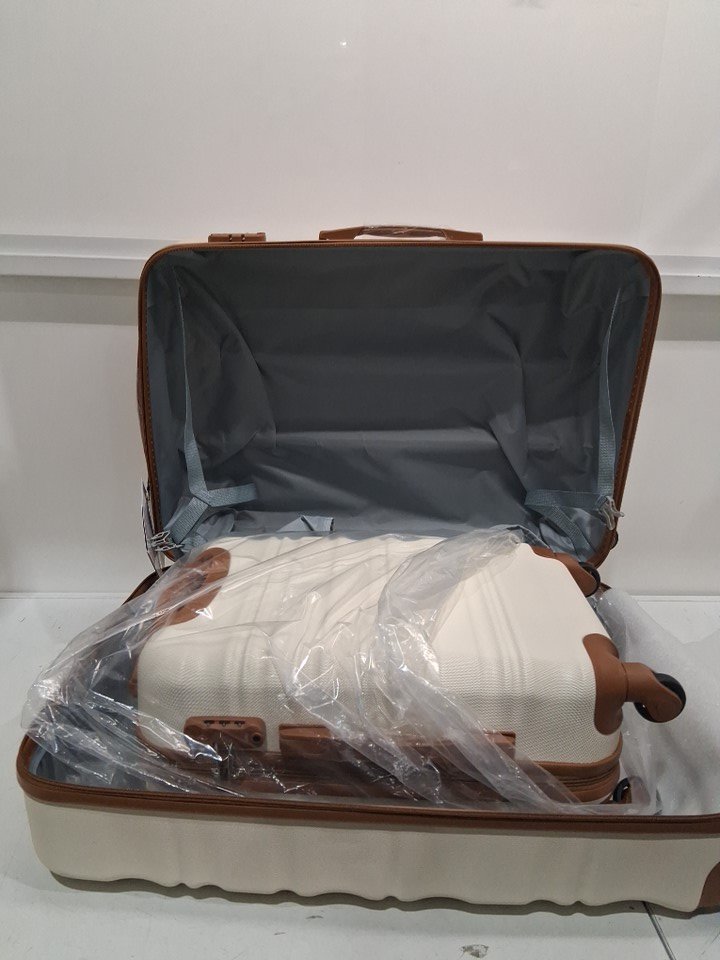 6Pc long vacation luggage set with 4 hardshell suitcases backpack and toiletry bag - 16"/20"/24"/28" suitcases and 1 travel backpack and 1 toiletry bag - white/brown - (model: luggagelv402)