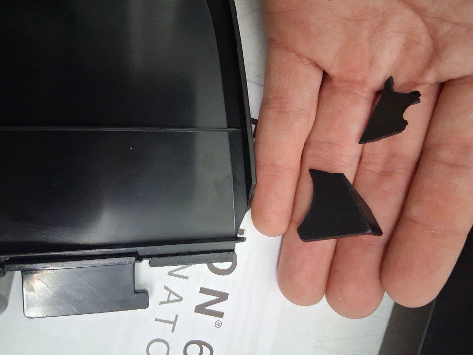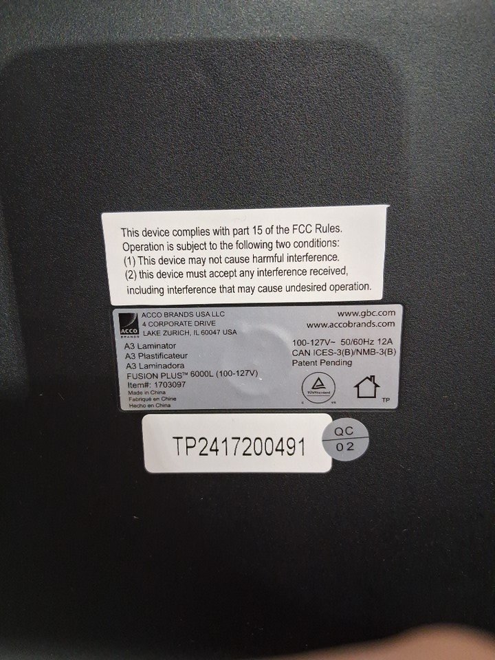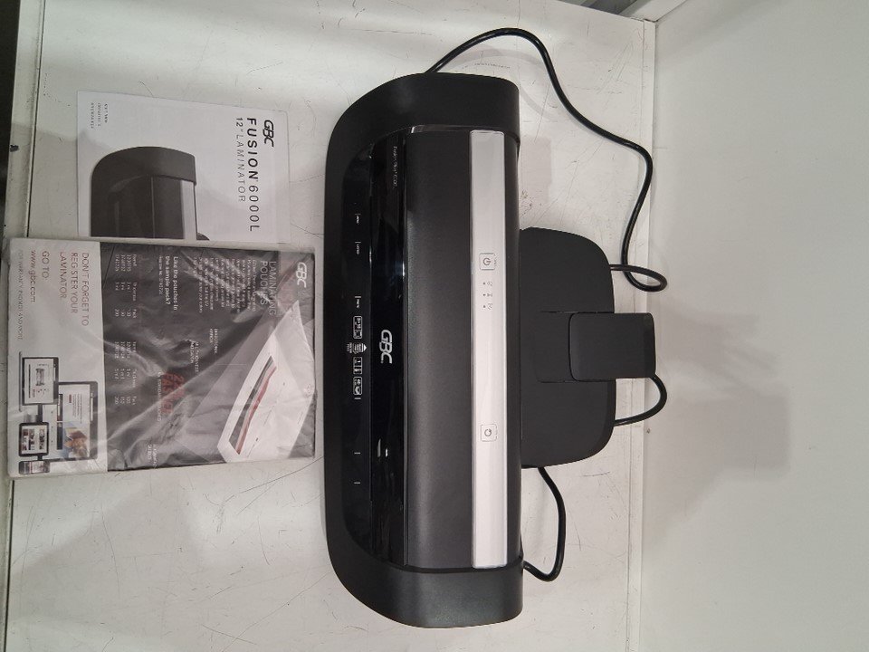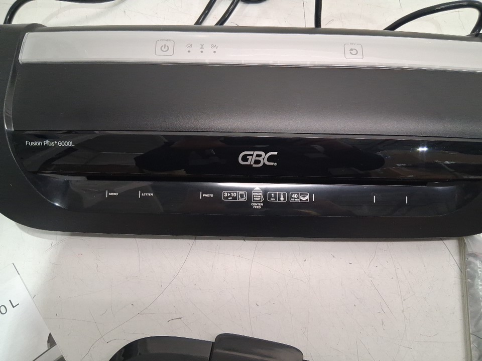 The corner broke off of the black plastic attachment piece for the laminator during shipping; the attachment piece still fits into the laminator and is not a function issue. The laminator was tested for basic power.