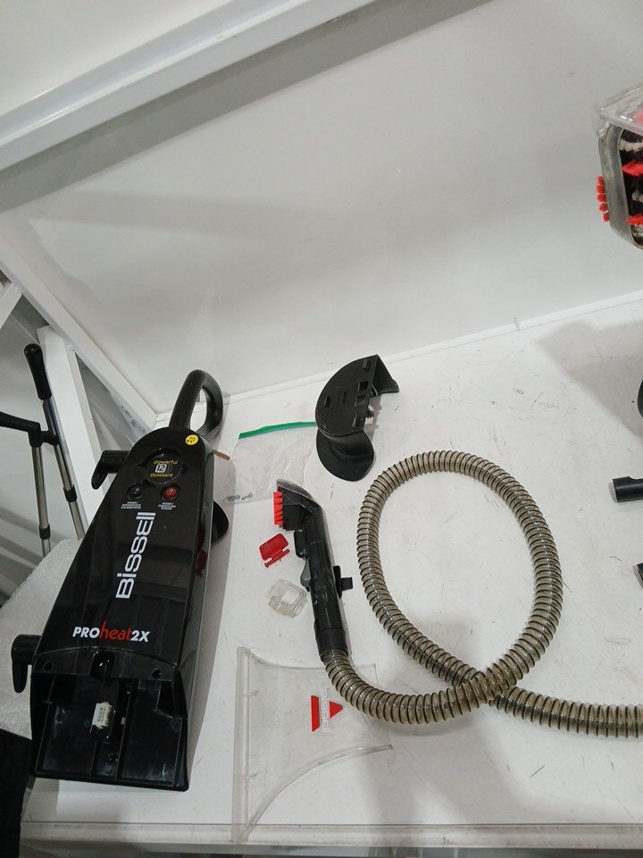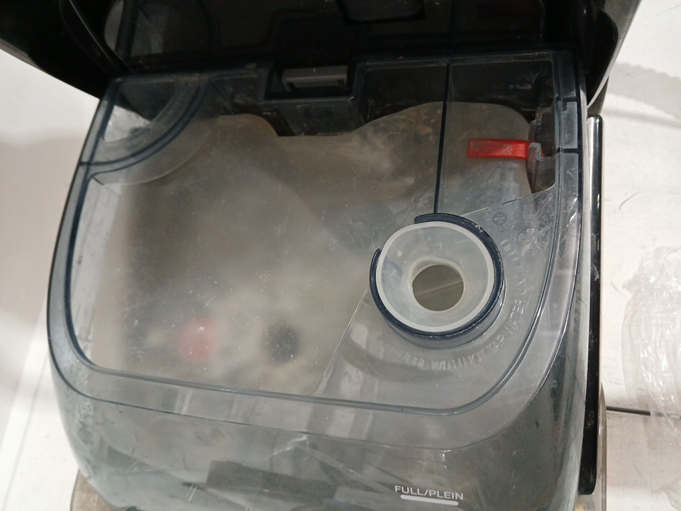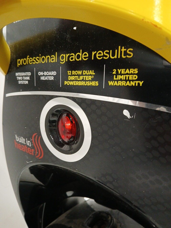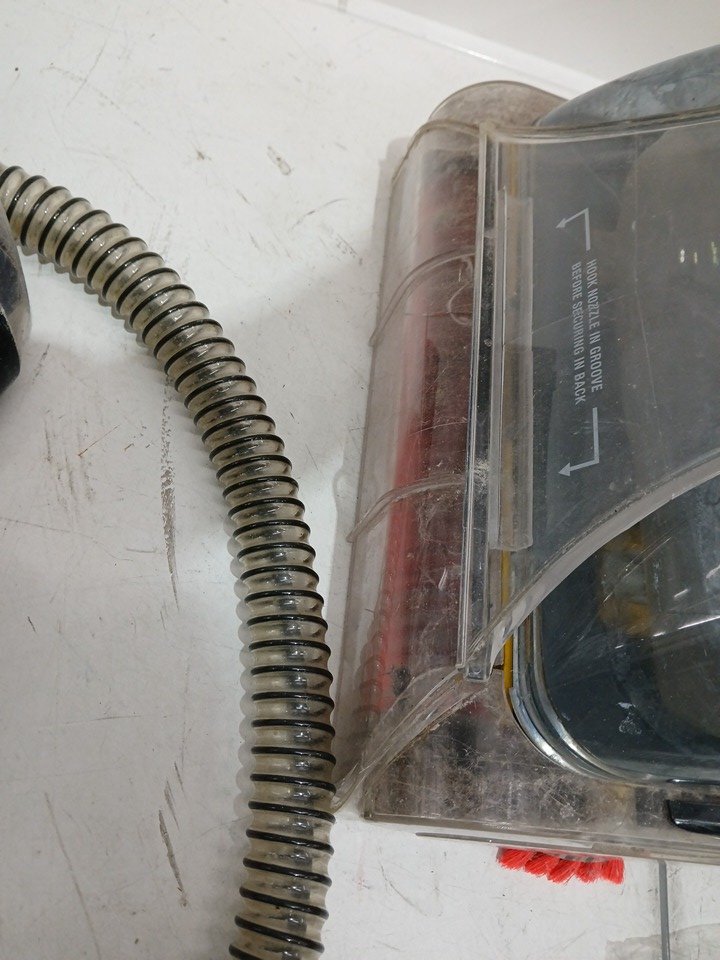 item has heavy signs of use overall and is broken at the front where the water reservoir is. It will not stay attached but will still fully function in this condition. There is some cracking and damage to the back unit where the hose would hang. Tested for power and function