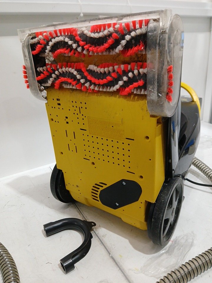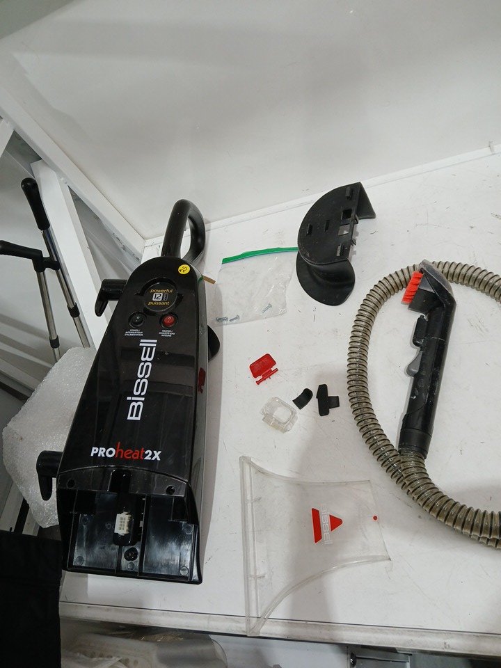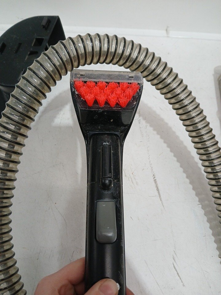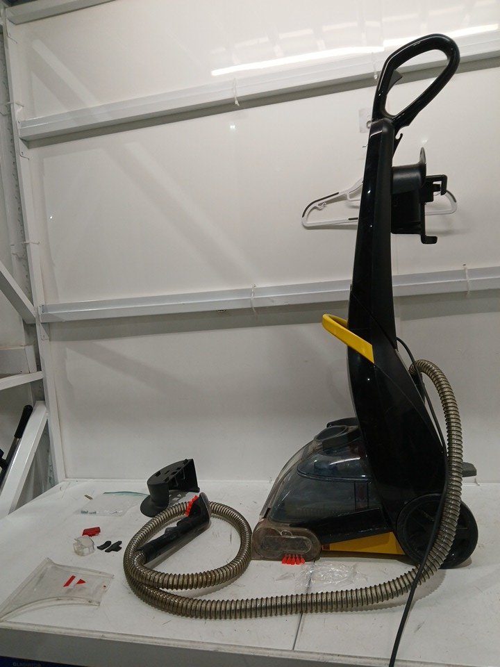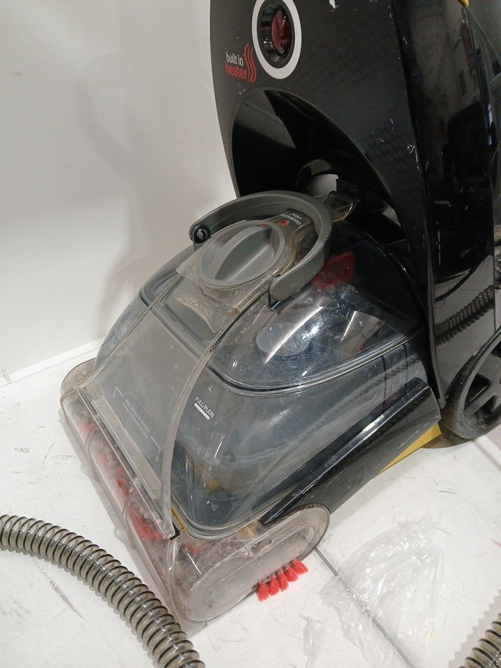 item has heavy signs of use overall and is broken at the front where the water reservoir is. It will not stay attached but will still fully function in this condition. There is some cracking and damage to the back unit where the hose would hang. Tested for power and function