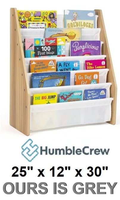 HUMBLECREW KIDS 6-tier supersized fabric and wood BOOK RACK STORAGE SHELF - 25" x 12" x 30" - GREY/WHITE (MODEL: WO76825)