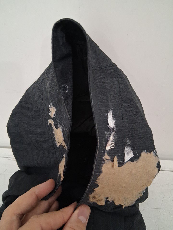Jacket hood arrived at inspection with overheated adhesive stuck to it. Most removed, still some residue remaining. (See photos)