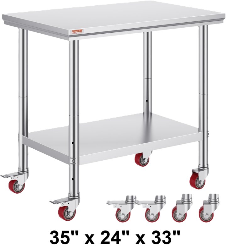 VEVOR Stainless-Steel Heavy-Duty Food Prep Workbench Table with Wheels - 35" x 24" x 33" - Silver (Model: GZT90X60L)