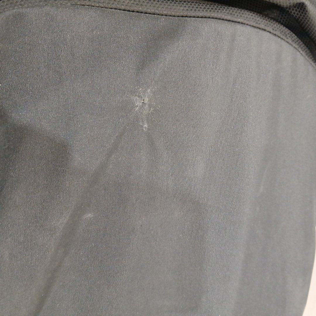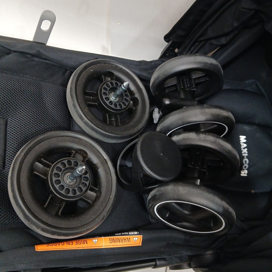 item shows signs of light use on the wheels, as well as some cosmetic marks & minor damage (small holes) on the fabric
