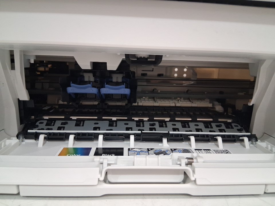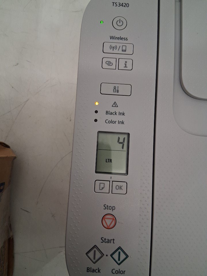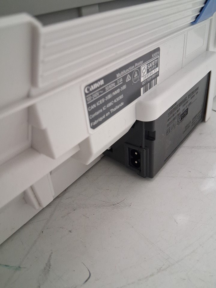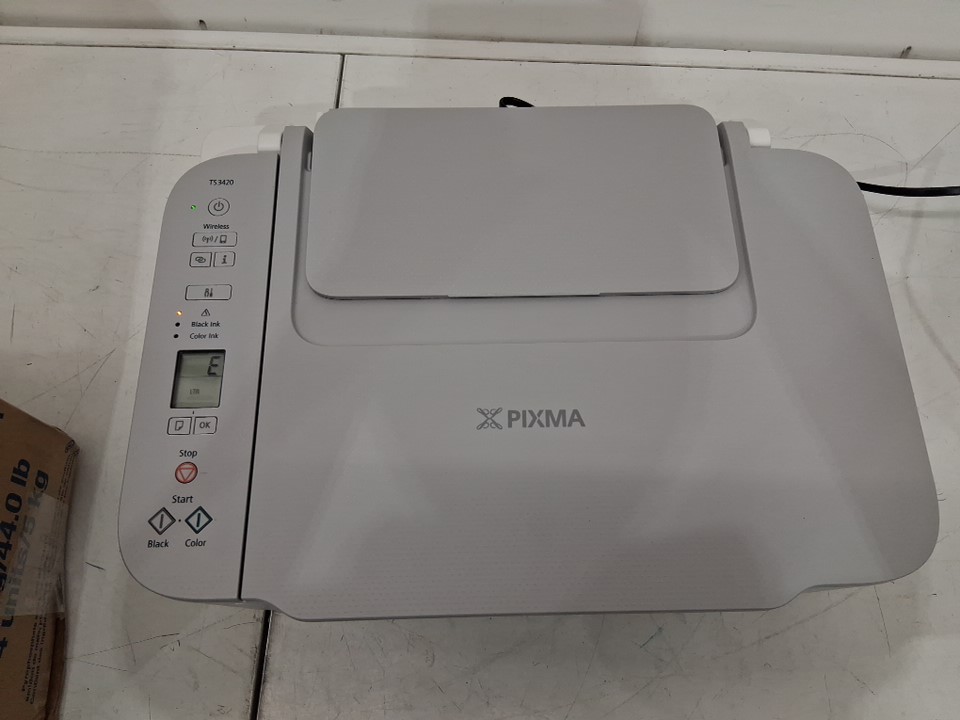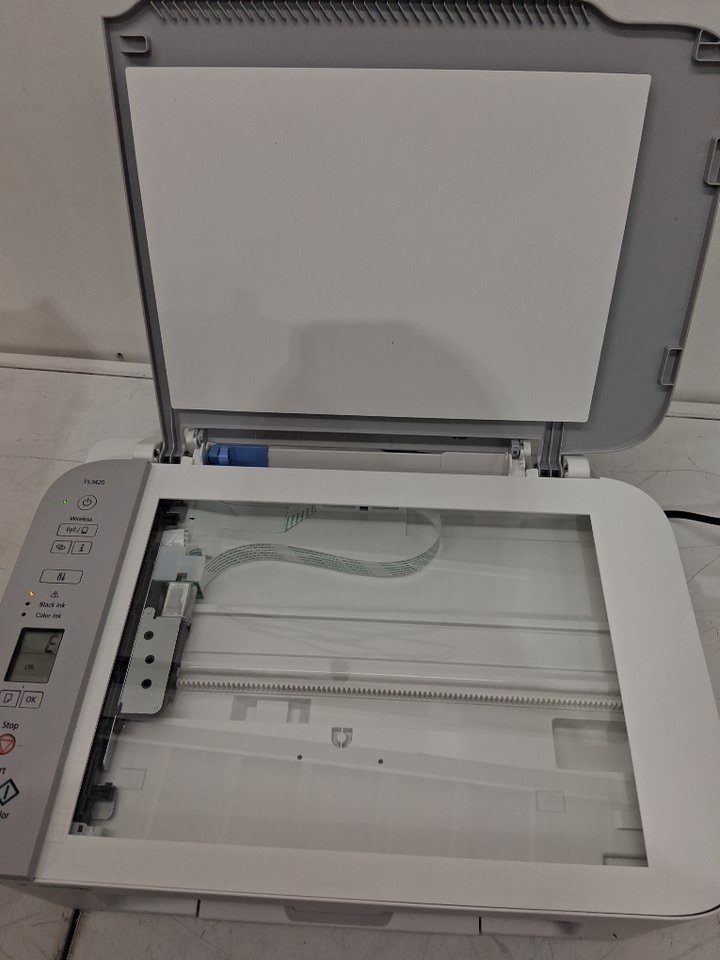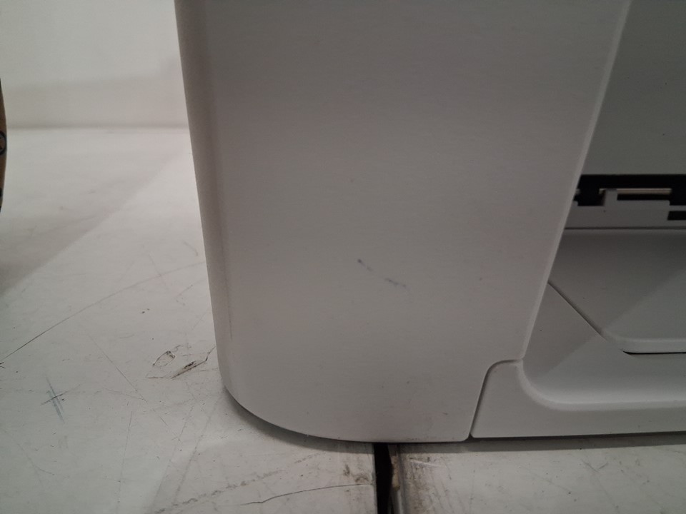 Ink cartridges are missing and can be replaced, power cord is also missing can be replaced. Printer has light scuffing on it. Has been tested for power