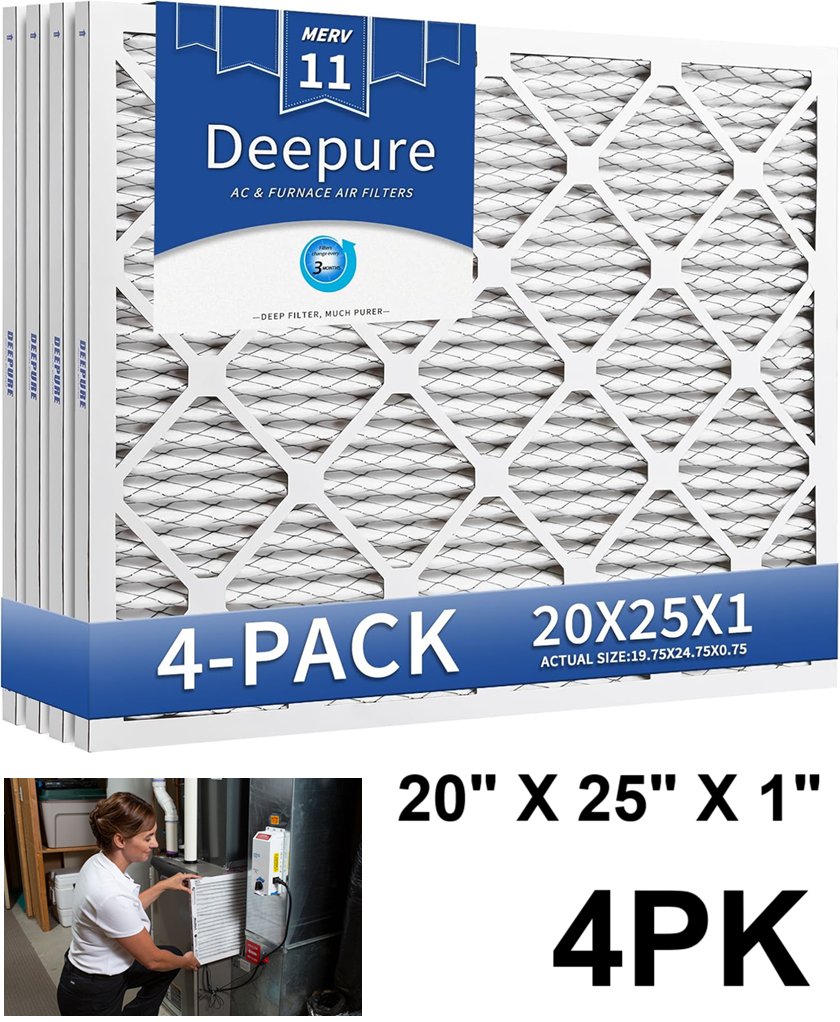 4pk deepure merv 11 anti-allergen pleated furnace filters - 20"x25"x1" - white