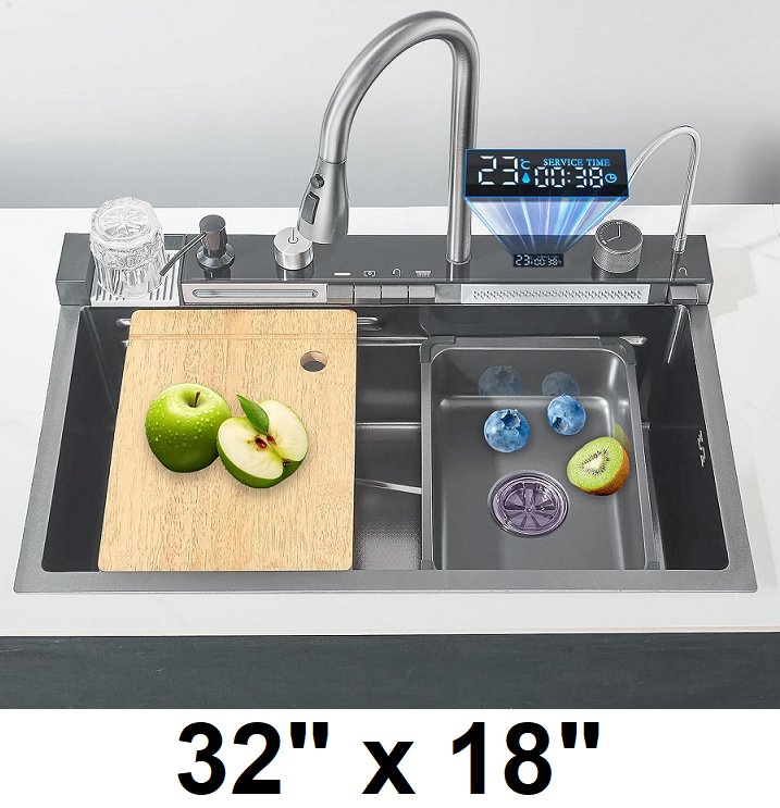 FGNIXLN stainless steel multifunctional smart waterfall kitchen sink - 32" x 18" - dark grey