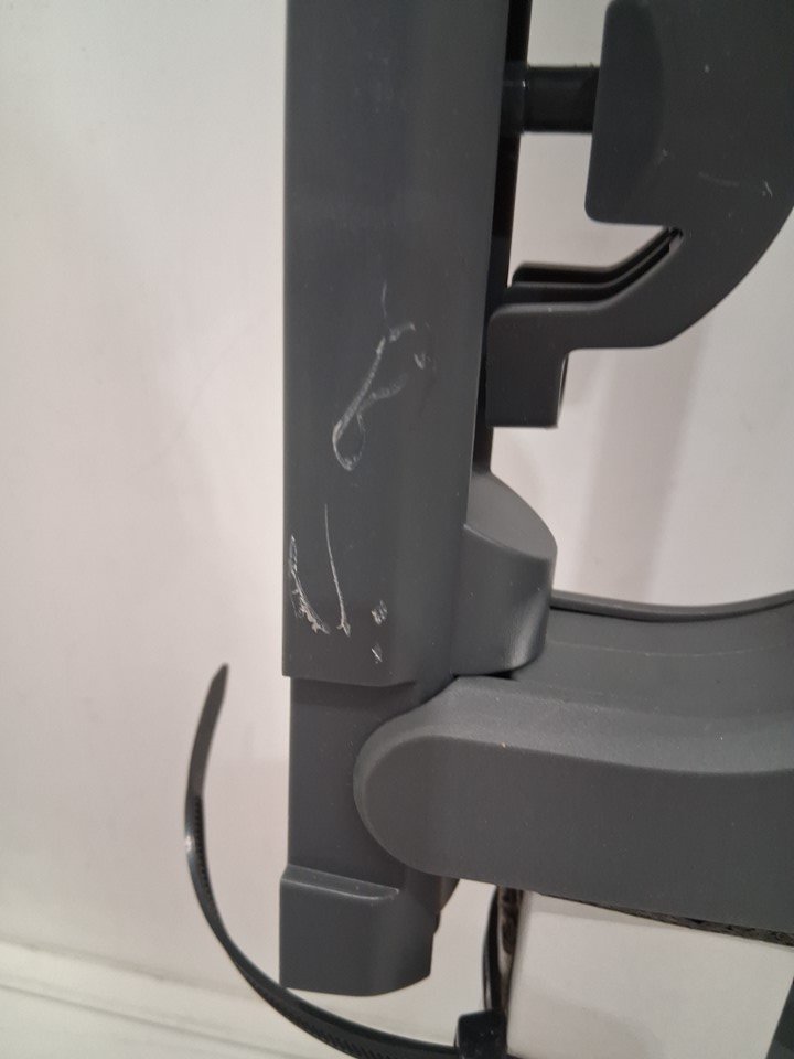 There are some scratches in the plastic on one corner of the gate due to shipping - see photos. Outside of this cosmetic damage, there are no visible issues or signs of use.