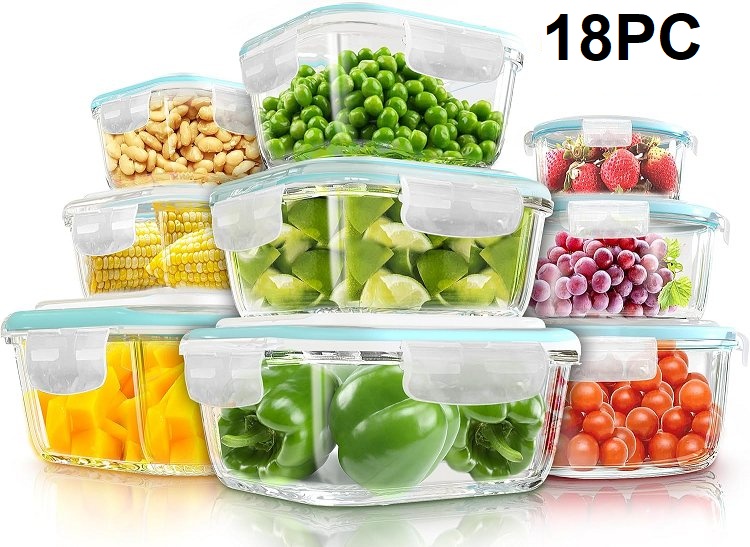 18pc kichly air tight glass food storage containers with snapping lids - various sizes - clear/blue (MODEL: uk0966)