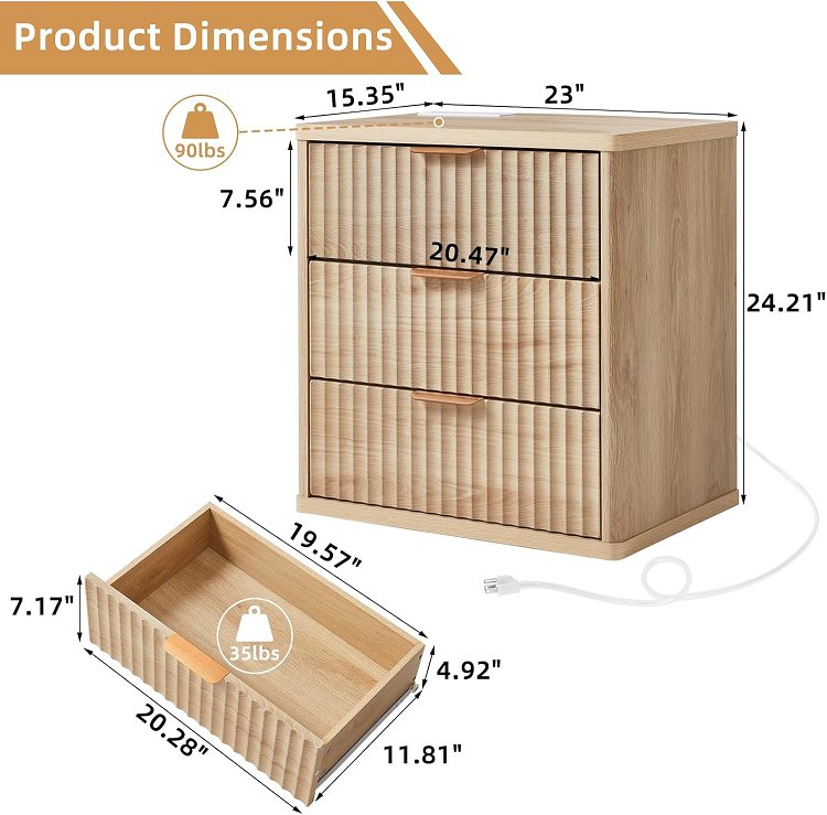Lerliuo Wide Fluted 3-drawer Night Stand side end table with Charging Station - 23" X 15.3" X 24.2" - wood (model: ll-at3dr-wood)