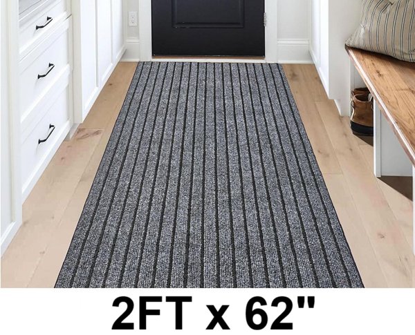 antpop indoor/outdoor machine washable absorbent carpet runner rug with non slip rubber backing - 2ft x 62" - black/grey stripes