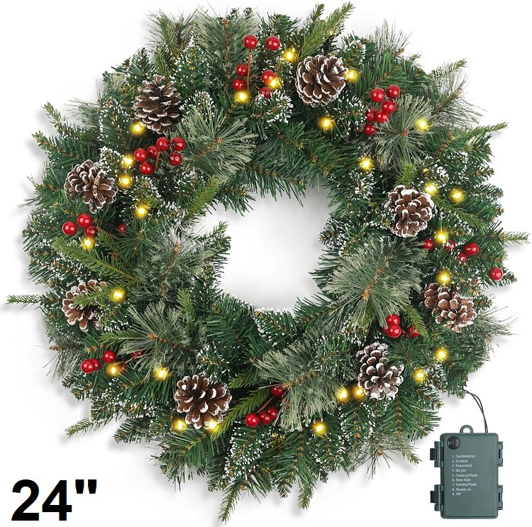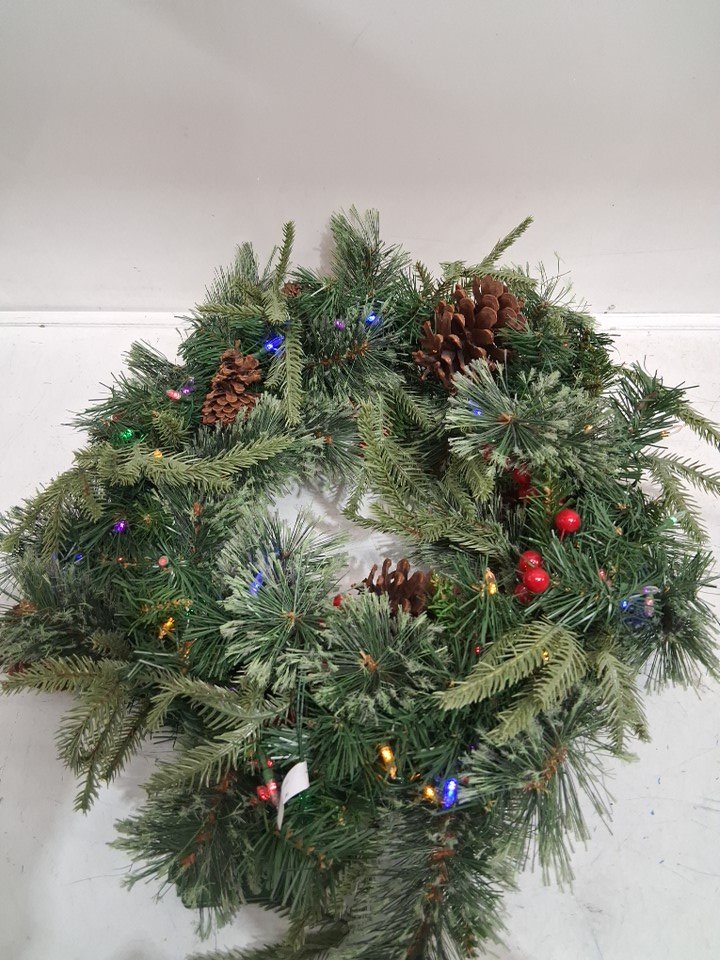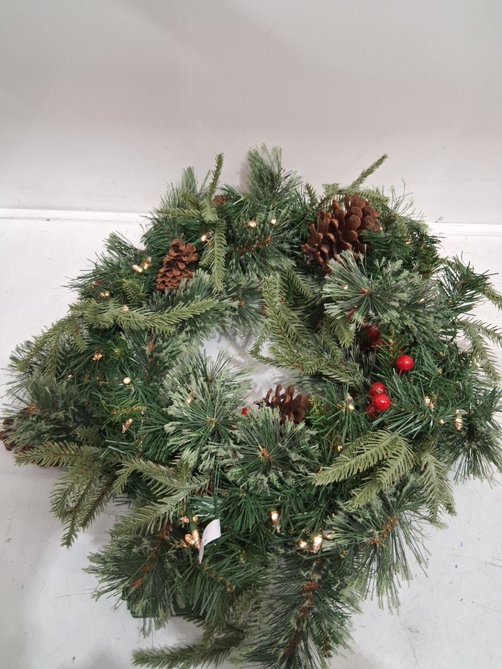 Christmas Wreath Snowy Pre-lit with pine-cones - 24" - green/red/brown
