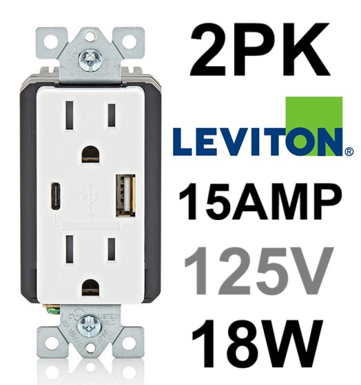 2PK LEVITON USB TYPE A/TYPE C WALL OUTLET CHARGER - 15AMP - 125V - 18W - WHITE (MODEL: T5638-B2W)