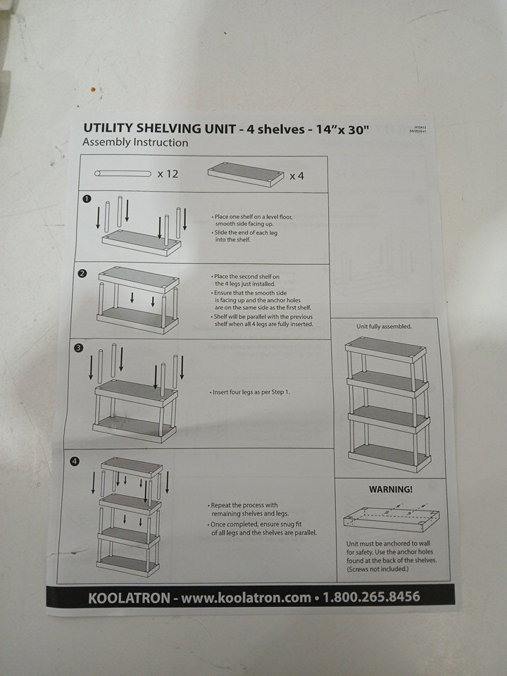 KOOLATRON 4 Tier utility Plastic Storage Shelves - 57" x 14" x 30" - white