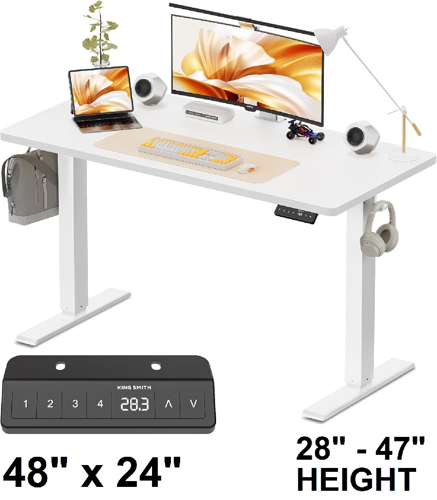 WALKINGDESK HEIGHT ADJUSTABLE ELECTRIC STANDING DESK - SIT TO STAND HOME OFFICE DESK WITH HOOKS - 28" TO 47" HEIGHT - 48" X 24" - WHITE (MODEL: FETDWHCAC2502244)
