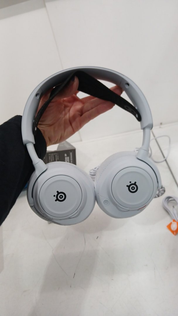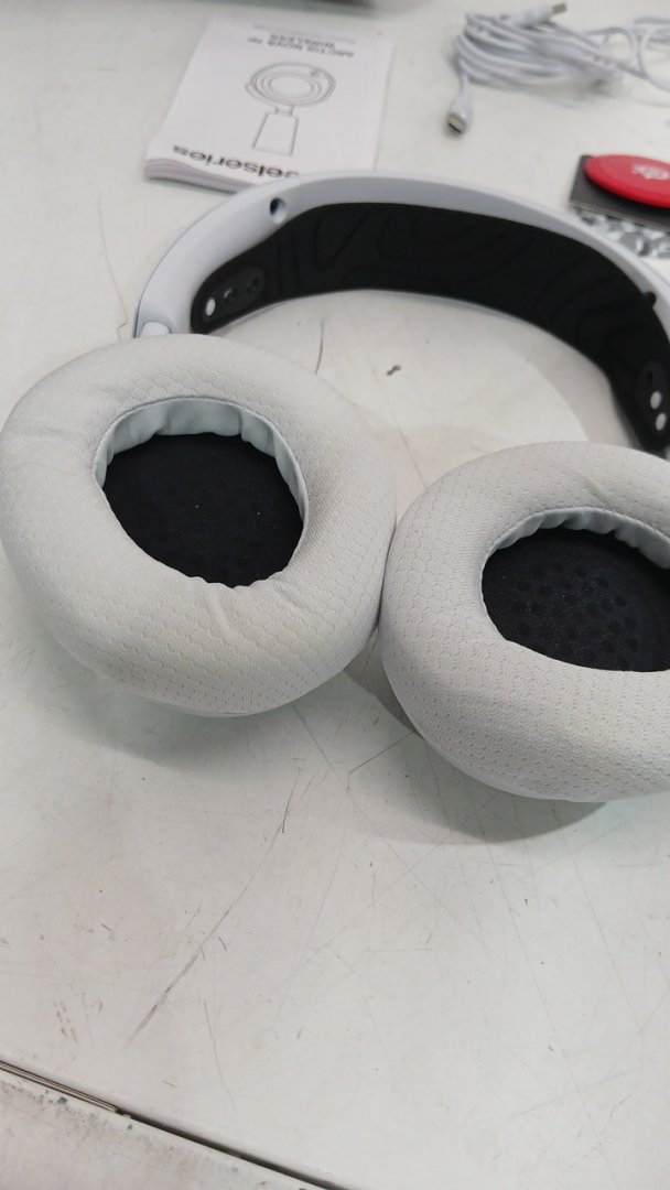 there is some minor discoloration on the ear pads and some residue on the headphones from previous use we are also missing the red replacement band and the dongle