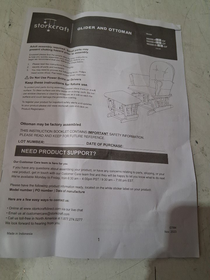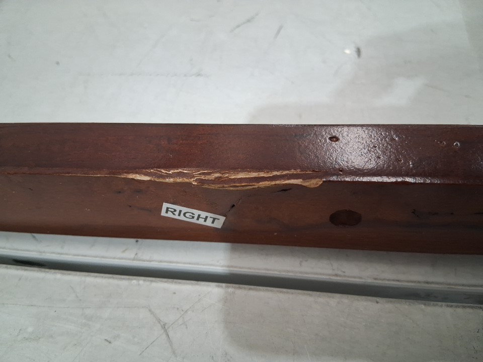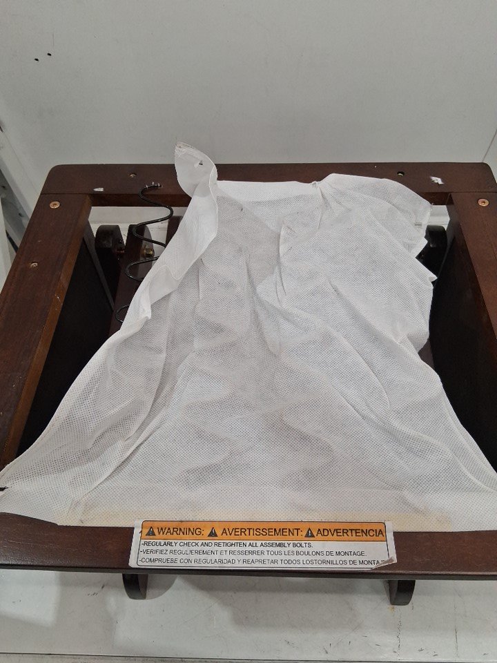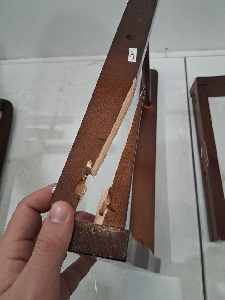 The left armrest is snapped in one place, the break appears clean enough that it should be possible to glue back into place. Additionally, the fabric under the seat has come loose/ripped in some places, and there are some light scuffs on some parts of the wood - see photos. Customer may also need to provide some additional hardware (screws, etc) in order to complete assembly as some may have gone missing during shipping. Outside of the noted damage and some dust on the cushions due to shipping/handling, there are no clear signs of prior use or assembly.