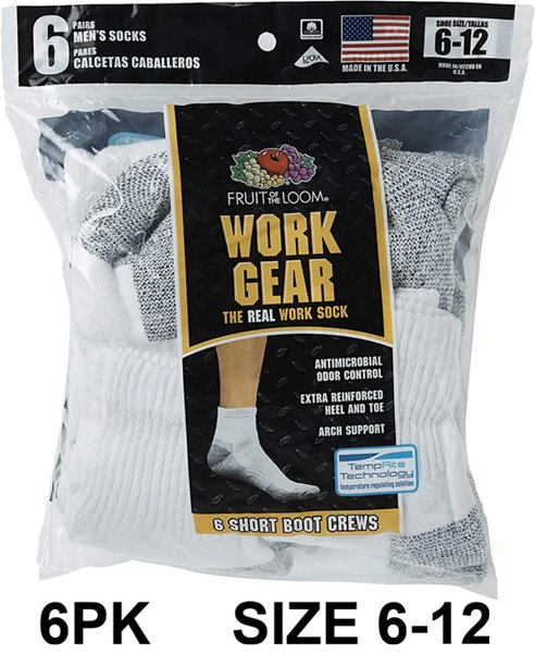 MENS FRUIT OF THE LOOM WORK GEAR CREW SOCKS - SIZE 6-12 - WHITE/GREY (STYLE: M8001W6US)