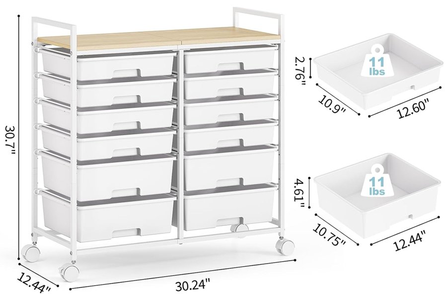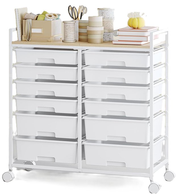 SYKIARIOL rolling cart with wooden tabletop and 12 drawers - 30.7" x 12.44" x 30.24" - white (model: