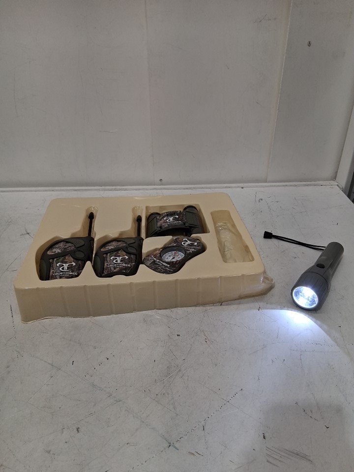 Products tested for power and function. Walkie talkies have strong static overlay making communication difficult.