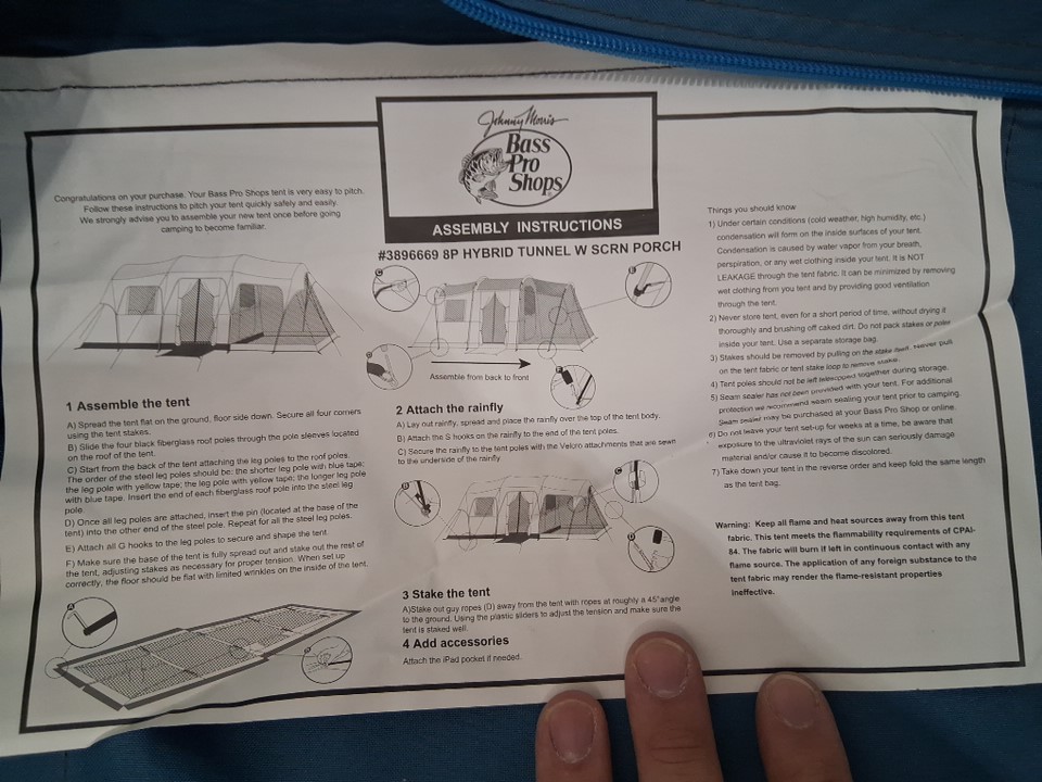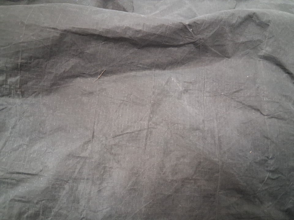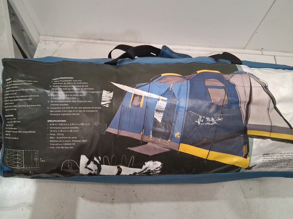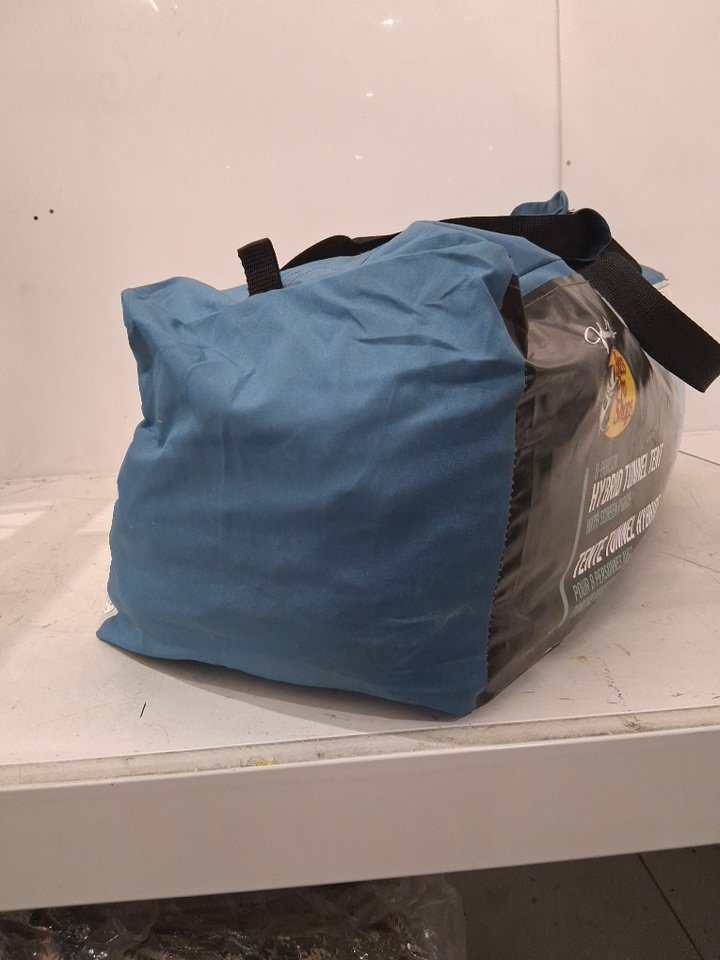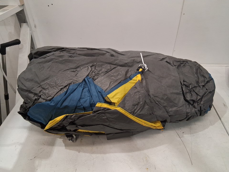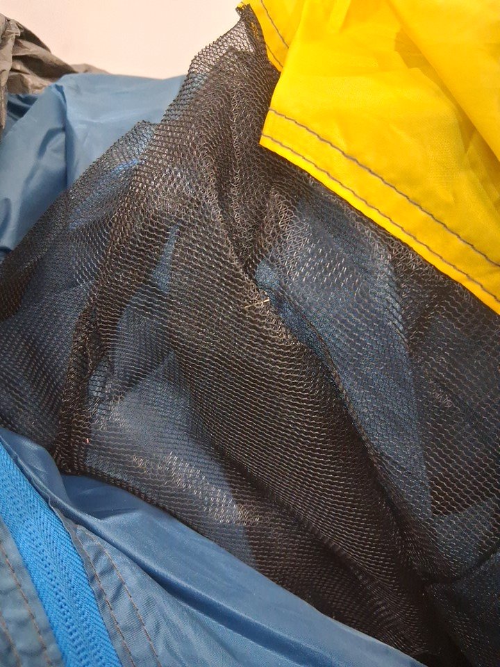There are some remnants of dead grass and dirt stuck in the tent's net, indicating some brief previous use - see photos. Other than being previously handled, the tent appears to be in good condition with no visible issues or damage.
