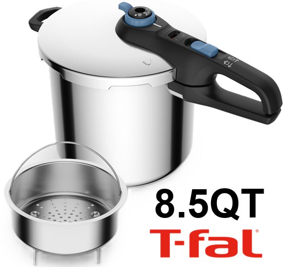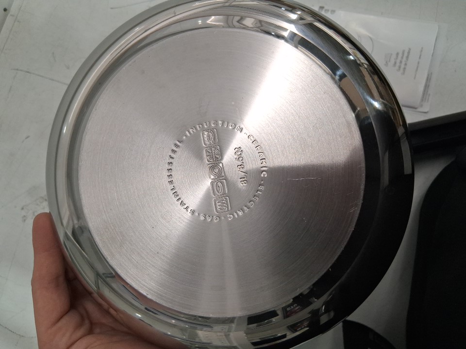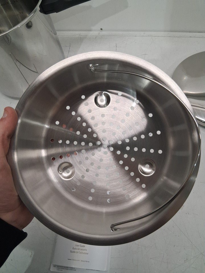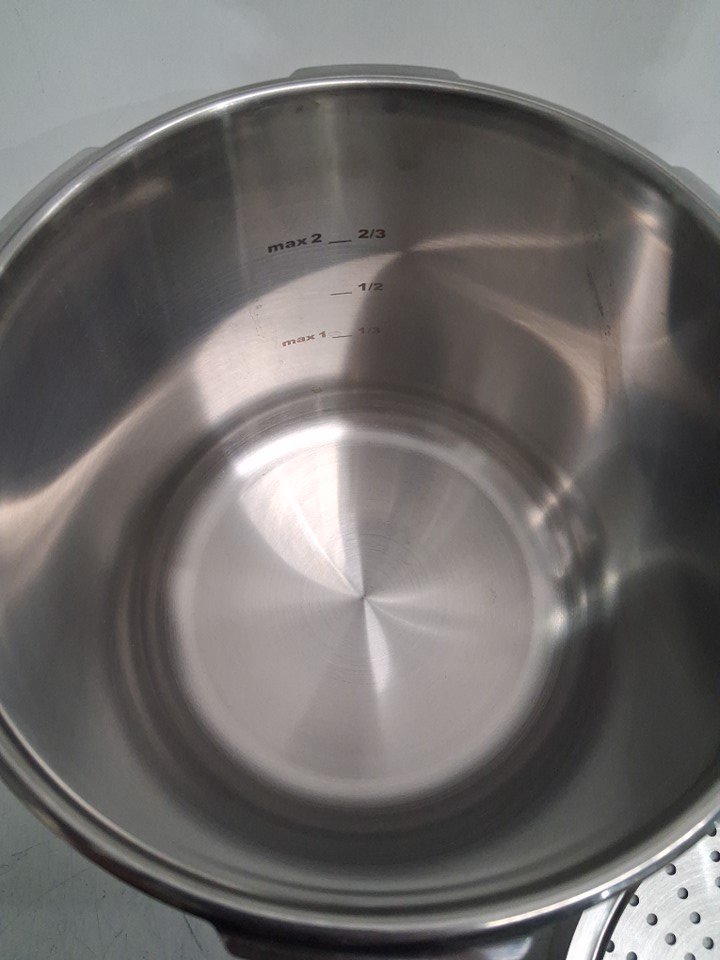 There are a couple of liquid stains/residue marks in the big pot and on top of the lid of the pressure cooker. The pressure cooker will need a quick cleaning before use.